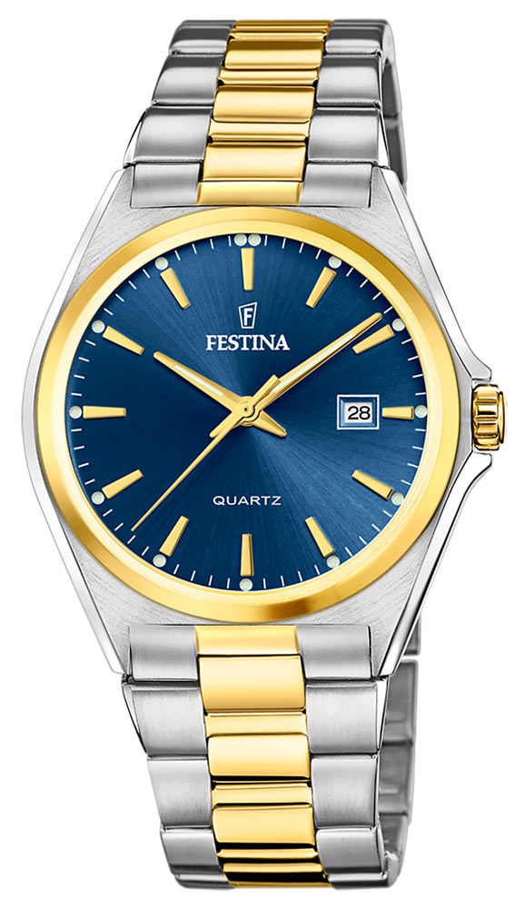 Vizuálně pozlacený náramek Festina Classic Bracelet vyniká nade vše: sofistikovaný ciferník, luxusní barvy, dvoučlánkový ocelový náramek potažený PVD a 3ručičkový quartz Machineek s funkcí data.