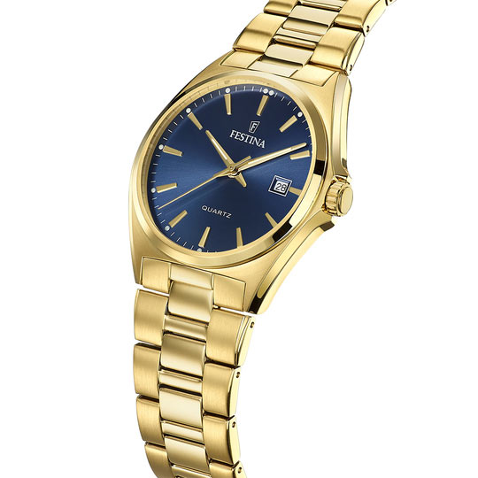 Quartzový Machineek japonské výroby, umístěný uvnitř pouzdra pozlacených pánských hodinek s modrým ciferníkem značky Festina. Poskytuje vysoce spolehlivé měření času. Je napájen vyměnitelnou baterií. Hodinky jsou zase ve třídě voděodolnosti 50 m a nabízejí o něco větší odolnost vůči kontaktu s vodou. Můžete jej mít na ruce, například při sprchování nebo koupeli.