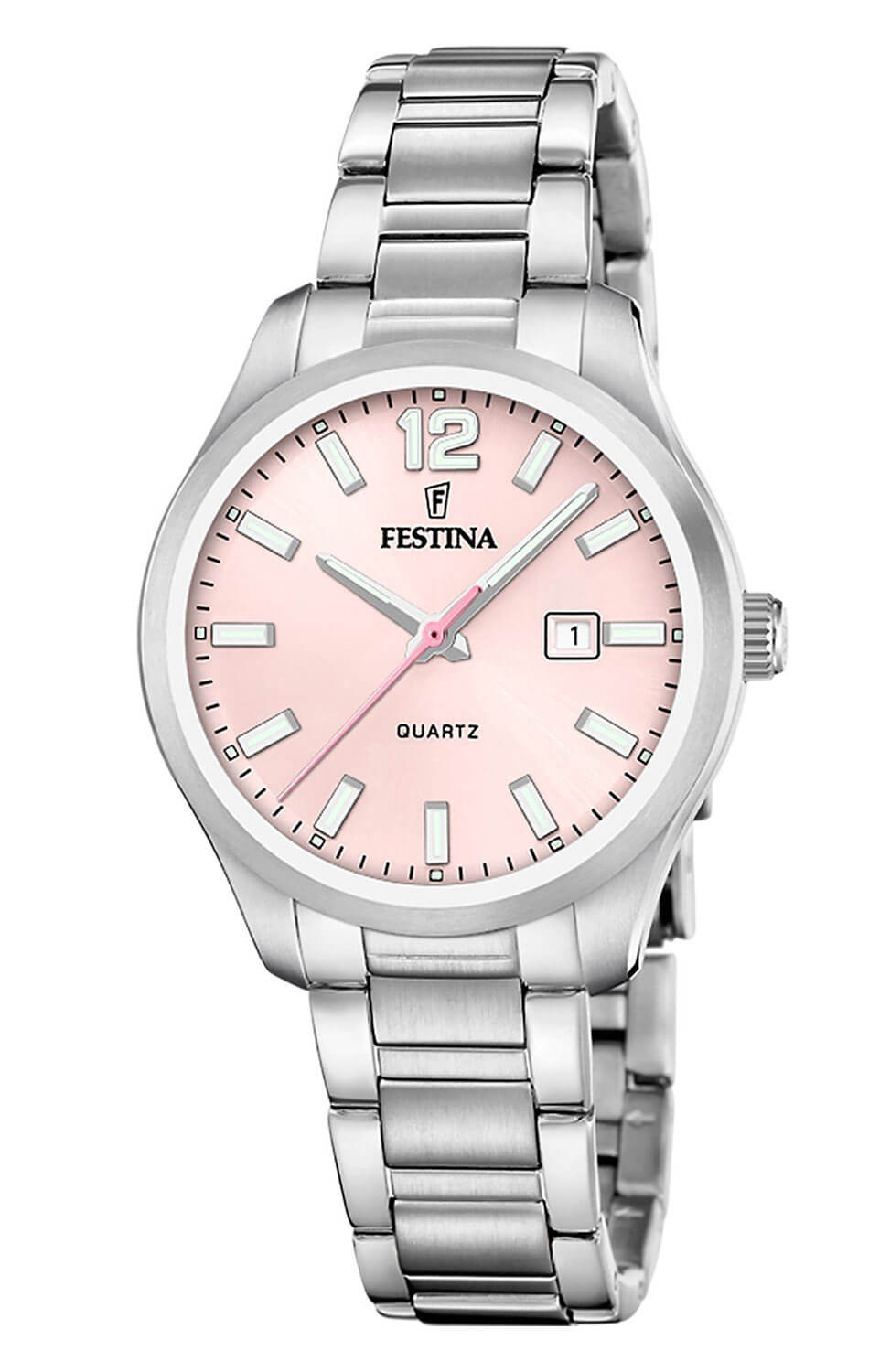 Dámské hodinky Festina Classic F20737/2 jsou určeny pro ženy, které si cení jednoduchosti a klasických tvarů více než pomíjivých trendů. Jde o model, který se nesnaží upoutat pozornost ozdobnými detaily – jeho předností je přehlednost a elegantní střídmost. Růžový ciferník s velkými arabskými číslicemi zaručuje snadné čtení času a modrá vteřinová ručička dodává celku jemný, svěží akcent.