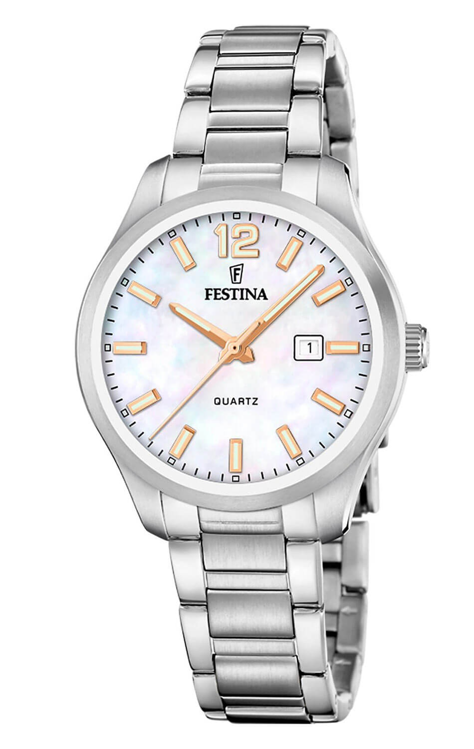 Dámské hodinky Festina Classic F20737/6 jsou volbou pro ženy, které si cení jednoduchosti a klasických tvarů více než pomíjivých trendů. Jde o model, který se nesnaží upoutat pozornost zdobnými detaily – jeho předností je přehlednost a elegantní střídmost. Bílý perleťový ciferník s velkými indexy zaručuje snadné odečítání času a zlacené ručičky dodávají celku jemný, svěží akcent.