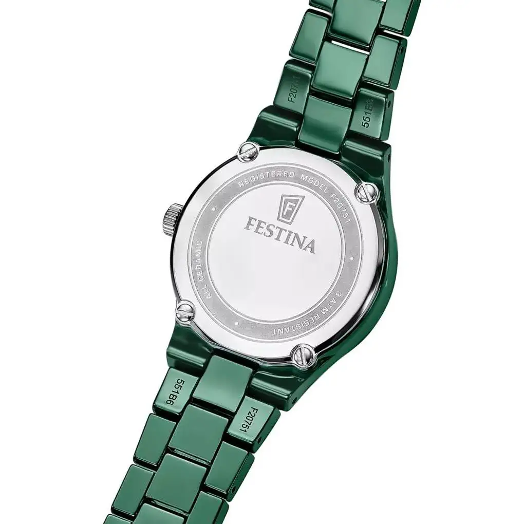 Dámské hodinky Festina Classics Ceramic F20751/6 jsou modelem, který spojuje jemnost barvy s moderním zpracováním. Krásný zelený odstín v keramickém provedení jim dodává lehkost a zároveň z nich činí výrazný, ženský akcent stylizace. Keramické pouzdro o průměru 30 mm bylo navrženo tak, aby harmonicky sedělo na zápěstí a podtrhlo jeho jemnost bez ztráty čitelnosti. Tento model není pouze elegantním doplňkem, ale díky použitým materiálům je také příjemný na dotek a šetrný k pokožce.