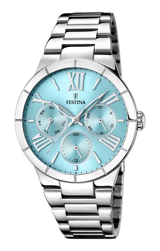 Překvapivým a vysoce avantgardním doplňkem jsou leštěné a aplikované římské číslice, které spolu s ostatními jednoduchými rejstříky tvoří osobitou typografii, na níž splývají 3 ruce. Mezi nimi dvě (hodina a minuta) jsou prolamované. Na okraji leštěného ciferníku v podmanivě tyrkysové barvě jsou navíc značky 60 minut. Celek je kryt odolným proti rozbití tvrzeným minerálním sklem. Pouzdro číselníku je středně velké 36,50 mm pouzdro vyrobené z vysoce kvalitní hypoalergenní a korozi odolné slitiny nerezové oceli. Jeho třída vodotěsnosti je 5 ATM (50 metrů). Třířadý ocelový náramek se elegantně zužuje do pohodlného a bezpečného motýlkového zapínání na dva knoflíky. Celé elegantní dámské sportovní hodinky Festina F16716/4 mají leštěný povrch. Pohon je přesný quartzový strojek napájený baterií.