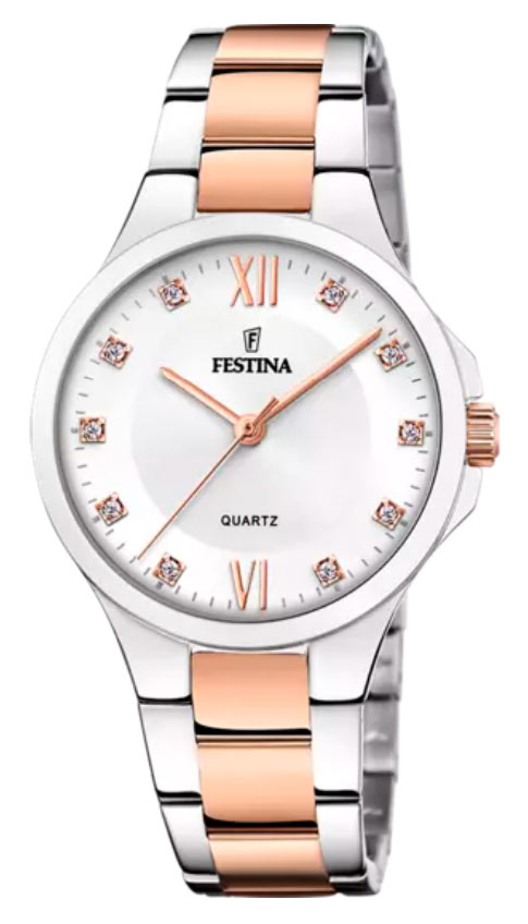 Stříbrné a zlaté dámské hodinky Festina Mademoiselle F20612/1 jsou dokonalou kombinací elegance a funkčnosti. Výrazný design je naplněn atraktivními doplňky, které budou chtít mít především dámy znalé módy. Kouzelně třpytivé krystaly Swarovski doprovázející aplikované římské indexy jako ukazatele hodin na třpytivém stříbrném ciferníku jsou jistě jedinečnými přednostmi tohoto modelu. Dvoubarevná záře pouzdra vyrobeného z nejkvalitnější oceli však také nesplní žádné přání. A to vše výrobce nabízel za mimořádně lákavou cenu. Elegantní dámské hodinky s ciferníkem Festina z kolekce Mademoiselle jsou perfektní nabídkou pro ženy, které chtějí oslnit každý den.