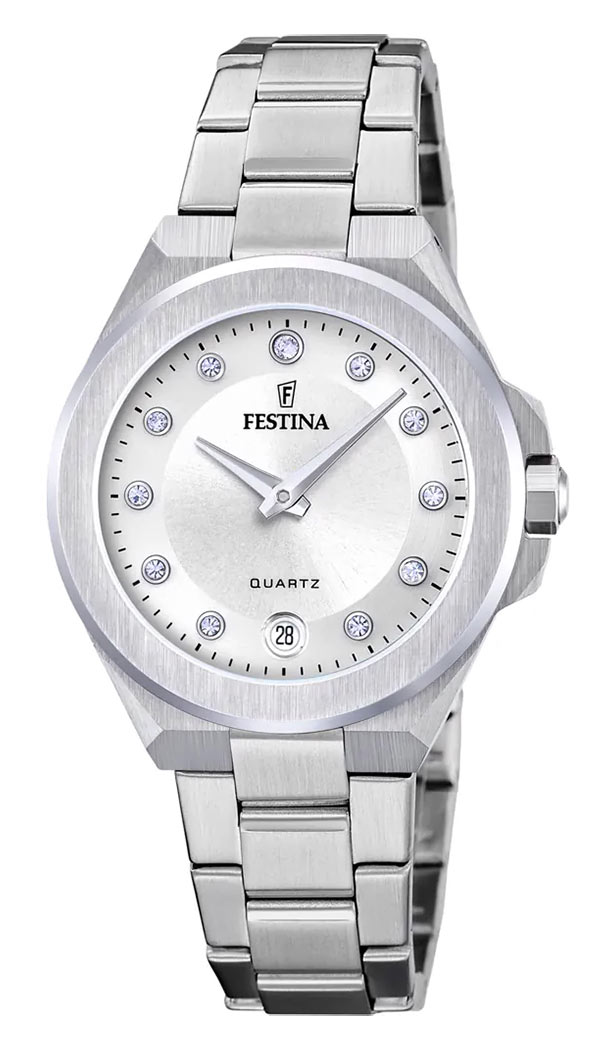 Ciferník vyniká nádherným zdobením v podobě lesklých zirkonových kamenů. Jedenáct pečlivě uspořádaných krystalů v celých hodinových bodech, spárovaných s ostrými ručičkami, ukazuje aktuální čas. Okénko s kulatým datem v 6 hodin ukazuje aktuální den v měsíci. Ciferník je minimalistický, ale elegantní. Majitel tohoto modelu bude schopen odečíst aktuální čas již po jediném pohledu. Dámské hodinky Festina na náramku budou kompletním doplňkem šatníku každé ženy.