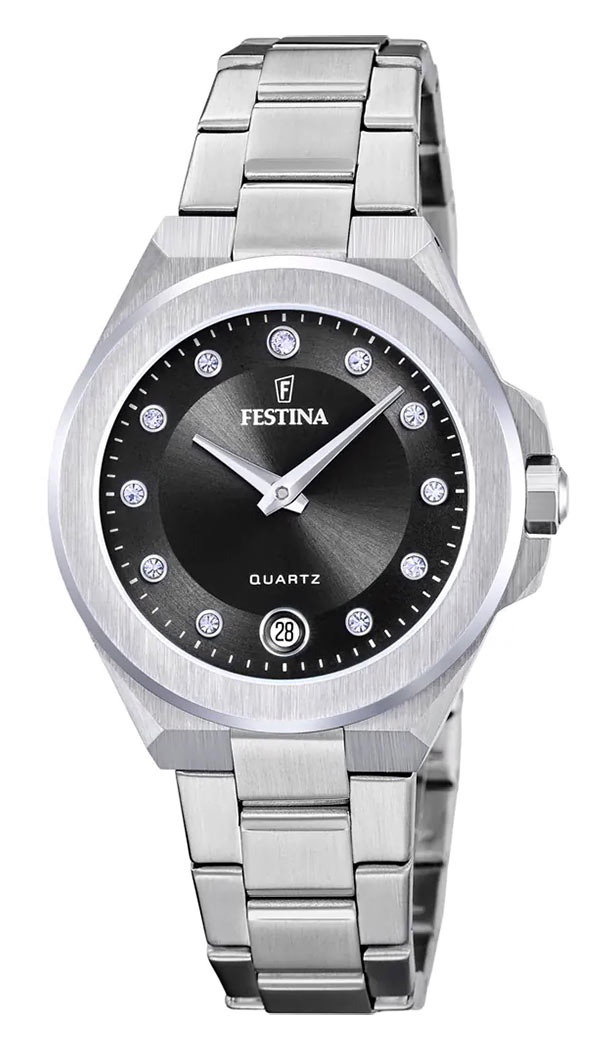 Ciferník vyniká nádherným zdobením v podobě lesklých zirkonových kamenů. Jedenáct pečlivě uspořádaných krystalů v celých hodinových bodech, spárovaných s ostrými ručičkami, ukazuje aktuální čas. Okénko s kulatým datem v 6 hodin ukazuje aktuální den v měsíci. Ciferník je minimalistický, ale elegantní. Majitel tohoto modelu bude schopen odečíst aktuální čas již po jediném pohledu. Dámské náramkové hodinky Festina budou kompletním doplňkem šatníku každé ženy.
