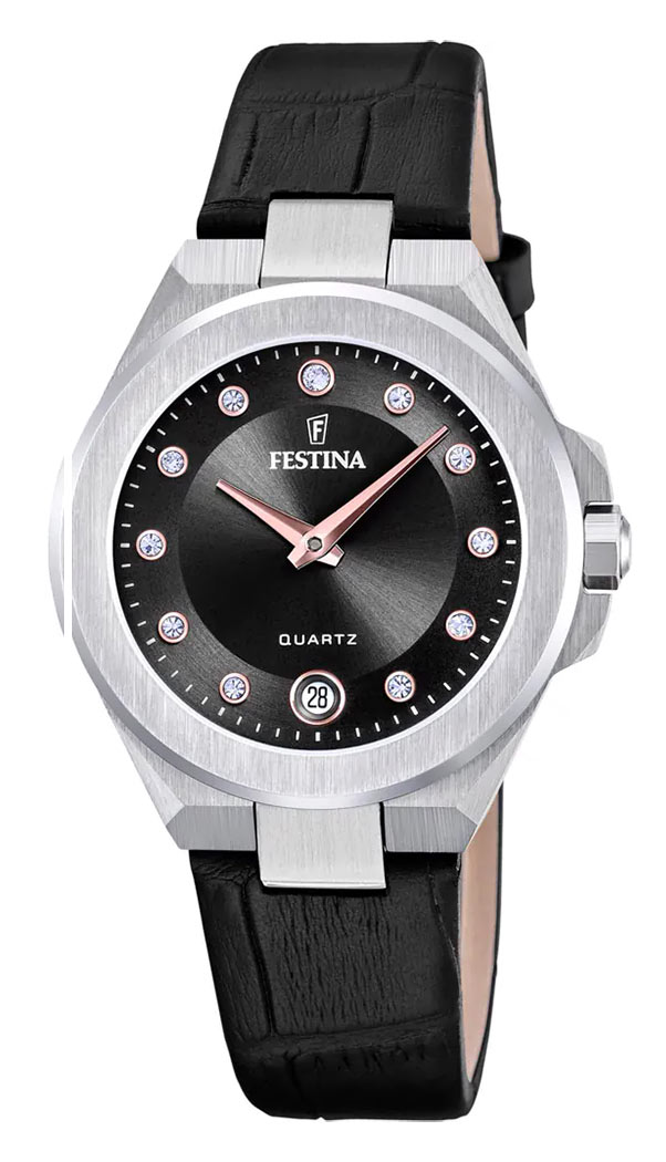 Ciferník se pyšní krásným zdobením v podobě lesklých zirkonových kamínků. Jedenáct pečlivě uspořádaných krystalů v celých hodinových bodech, spárovaných s ostrými ručičkami, ukazuje aktuální čas. Okénko s kulatým datem v 6 hodin ukazuje aktuální den v měsíci. Ciferník je minimalistický, ale elegantní. Majitel tohoto modelu bude schopen odečíst aktuální čas již po jediném pohledu. Dámské hodinky Festina na koženém řemínku budou kompletním doplňkem šatníku každé ženy.