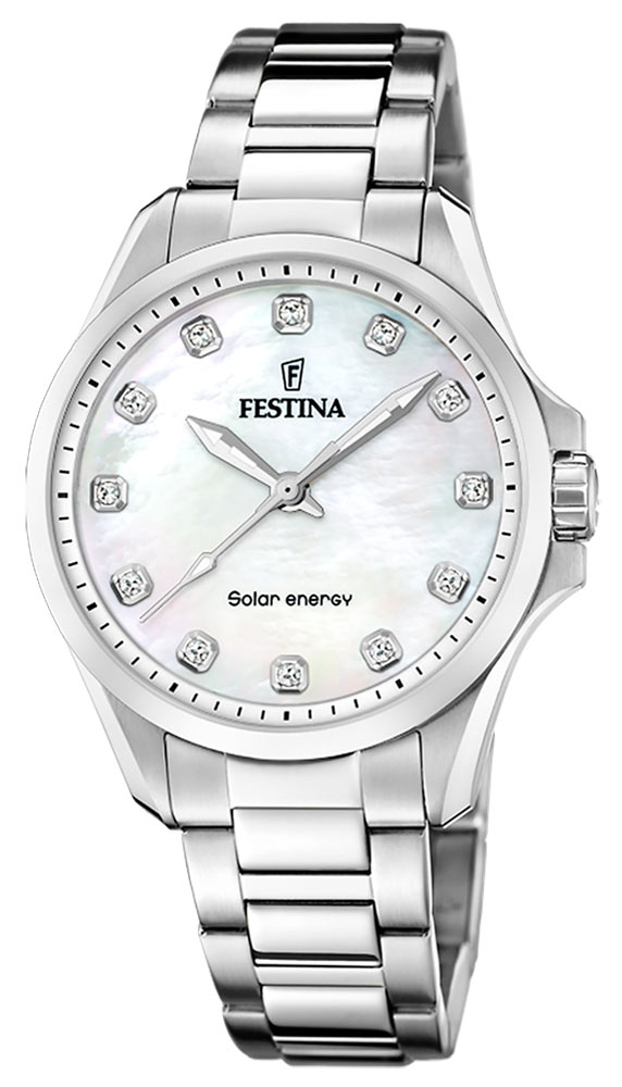 Jemné dámské solární hodinky Festina Petite. Elegantní perleťový ciferník osazený krystaly. Tvarované ruce vyplněné luminiscenčním materiálem. Japonský quartzový Machineek se solárním modulem. Pouzdro a náramek z nerezové oceli 316L se dvěma povrchovými úpravami - leštěné a kartáčované.