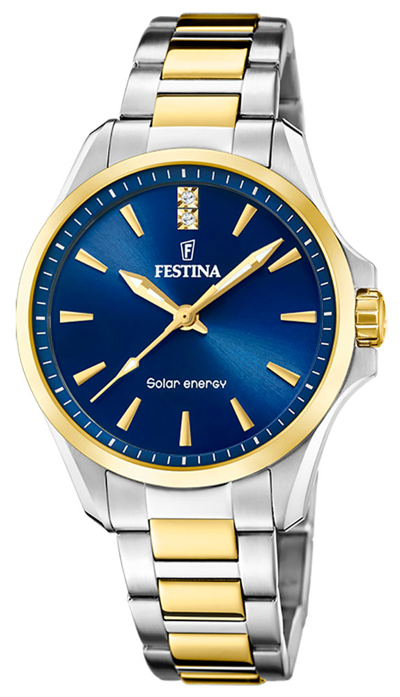 Dámské solární hodinky Festina Petite bicolor. Broušený modrý ciferník s pozlacenými indexy a krystaly na 12. hodině Tvarově pozlacené ručičky vyplněné luminiscenčním materiálem. Japonský quartzový Machineek se solárním modulem. Pouzdro a náramek z nerezové oceli 316L se dvěma povrchovými úpravami - leštěné PVD zlato a broušené.