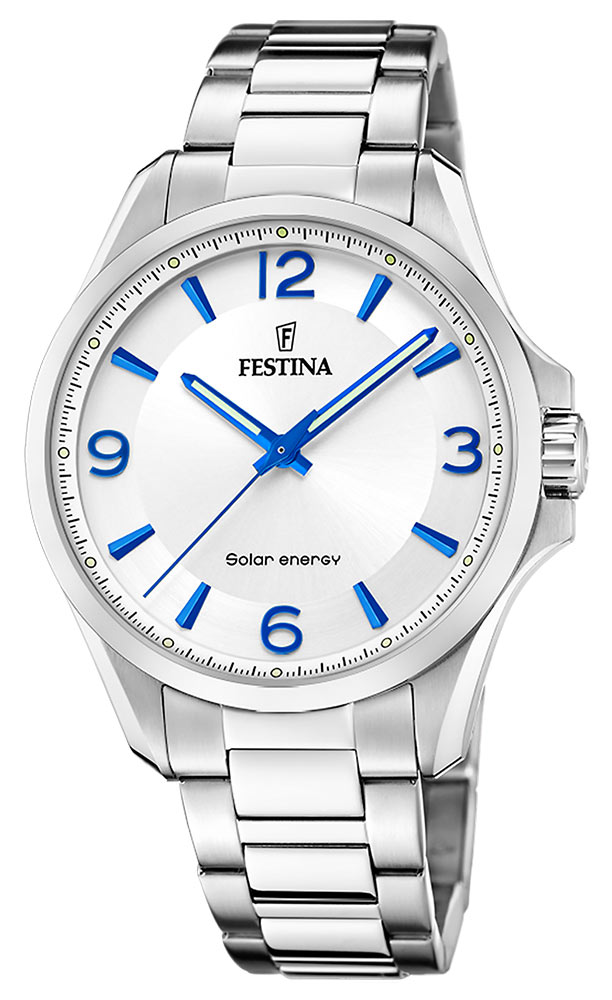 Festina Petite Solar Energy jsou pánské solární hodinky vyrobené z nerezové oceli 316L. Díky obsahu molybdenu poskytuje ocel třídy 316L výrazně větší odolnost proti korozi než oceli nižší třídy. Pouzdro má průměr 41,5 mm. Třířadý náramek se zapíná na dva knoflíky, díky čemuž vám hodinky hned po odepnutí nespadnou ze zápěstí. Elegantní ciferník s leštěným a saténovým povrchem je chráněn minerálním sklem. Pečlivě aplikované indexy, arabské číslice a ručičky zaručují vynikající míru čitelnosti, kterou doplňuje luminiscenční materiál. Jejich modrý odstín dodává tomuto monochromatickému modelu retro atmosféru. Stříbrné pánské náramkové hodinky Festina Petite mají klasický vzhled. Stojí za tím: nadčasový tvar a barvy, stejně jako vysoce kvalitní materiály a povrchové úpravy.
