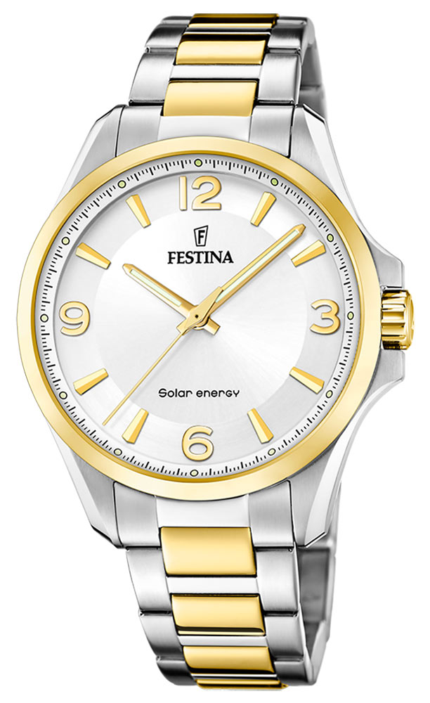Festina Petite Solar Energy jsou pánské solární hodinky vyrobené z nerezové oceli 316L s bicolor PVD úpravou. Díky obsahu molybdenu poskytuje ocel třídy 316L výrazně větší odolnost proti korozi než oceli nižší třídy. PVD povlak zase poskytuje speciální barevnou hloubku, zvyšuje odolnost proti poškrábání a je bezpečný i pro alergiky. Pouzdro má průměr 41,5 mm. Třířadý náramek se zapíná na dva knoflíky, díky čemuž vám hodinky hned po odepnutí nespadnou ze zápěstí. Elegantní ciferník s leštěným a saténovým povrchem je chráněn minerálním sklem. Pečlivě aplikované indexy, arabské číslice a ručičky zaručují vynikající míru čitelnosti, kterou doplňuje luminiscenční materiál. Jejich zlatý tón dodává tomuto modelu luxusní retro nádech. Pozlacené pánské hodinky na bicolor náramku Festina Petite mají klasický vzhled. Stojí za tím: nadčasový tvar a barvy, stejně jako vysoce kvalitní materiály a povrchové úpravy.
