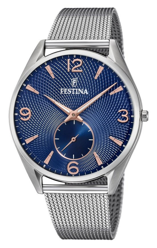 Pánské hodinky Festina Retro F6869/2 o velikosti 41,5 mm jsou ideální nabídkou pro milovníky klasiky a elegance. Model zaujme originálním designem, který vzbuzuje zvěDavosat jak z dálky, tak z blízka. Kombinace ergonomického náramku ze síťoviny a gilošovaného modrého ciferníku s malou vteřinovou ručkou a akcentem z růžového zlata vyjadřuje čistou esenci vintage stylu.