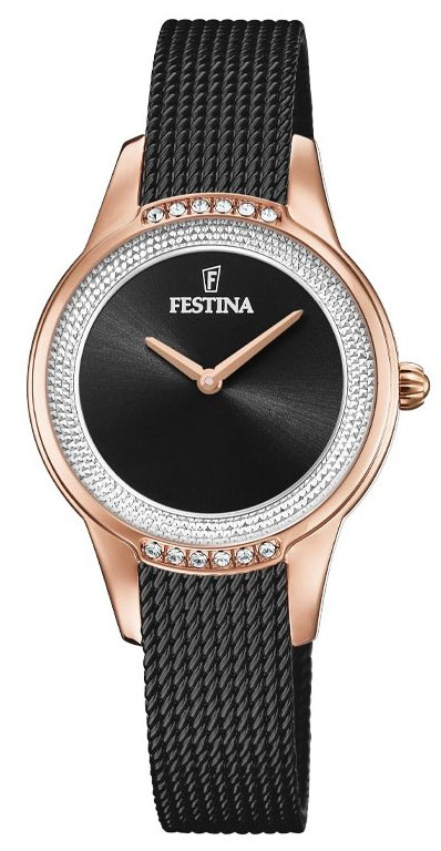 20496/2 kombinuje pokročilou technologii přesného quartz Machineku s ohromující, opojnou estetikou. Festina, vyráběná v jednom z renomovaných výrobních center, zajišťuje svou spolehlivost, originalitu a styl oceňovaný léta. Vyobrazená v harmonické kompozici mnohotvárného černého a růžového zlata PVD se stříbřitým leskem, který oživuje náladu a upoutá pozornost, je určena ženám, které vědí, jak důležitá jsou v životě jemná gesta a akcenty. Dokonalou kombinaci doplňuje honosné zdobení broušeného ciferníku, osázeného krystaly Swarovski, které dokonale koresponduje s ocelovým pevně spleteným černým náramkem v milánském stylu PVD. Materiál náramku - stejný, který charakterizuje i 30mm pouzdro, zaručuje vysokou odolnost proti povrchové korozi, poškrábání nebo zašednutí. Díky tomu si může být uživatel jistý svým výběrem, který bude důstojně a stále příznivě zdobit jeho zápěstí po mnoho let.