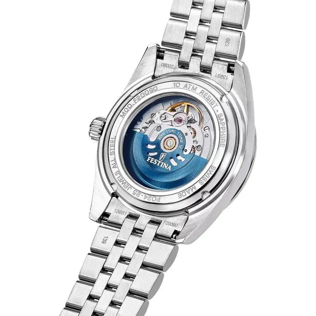 Festina Swiss Made Automatic F20090/2 jsou pánské automatické hodinky navržené s ohledem na každodenní funkčnost a nadčasovou stylistiku. Pouzdro o průměru 41 mm vyrobené z nerezové oceli dobře sedí na zápěstí a charakteristická vroubkovaná luneta dodává celku výrazný charakter inspirovaný klasickými sportovně-elegantními hodinkami. Modrý, dobře čitelný ciferník s výraznými indexy a datovníkem zajišťuje rychlé odečtení času v každé situaci, zatímco ocelový náramek podtrhuje pevný a univerzální styl tohoto modelu.