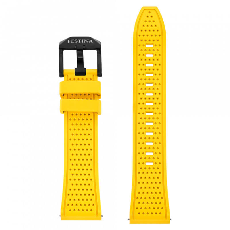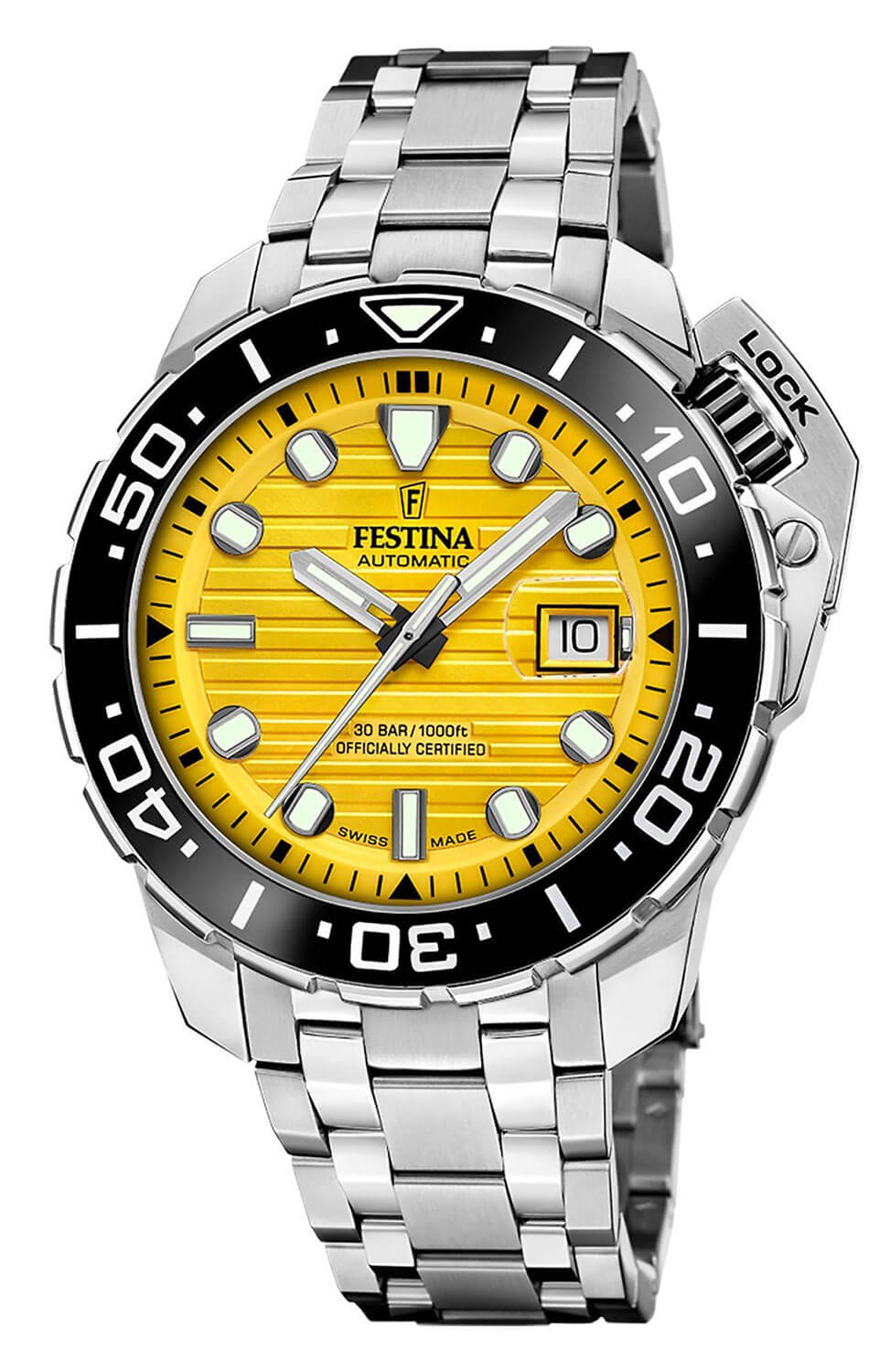 Pod odolným safírovým sklíčkem se nachází pečlivě navržený žlutý ciferník ve stylu diver. Vybavený výraznými ručičkami a indexy poskytuje snadné čtení času na první pohled. Tyto prvky jsou pokryty luminiscenční vrstvou, díky níž zůstávají hodinky Festina F20043-1 čitelné i v naprosté tmě. Na ciferníku se nachází také datumovka, jejíž čtení usnadňuje integrovaná lupa. Srdcem tohoto modelu je švýcarský automatický mechanismus Newton Soprod, který se vyznačuje přesností potvrzenou certifikátem COSC. Tento spolehlivý mechanismus exceluje jak při extrémních ponorech, tak v každodenních situacích, a nabízí bezkonkurenční přesnost v každé situaci.
