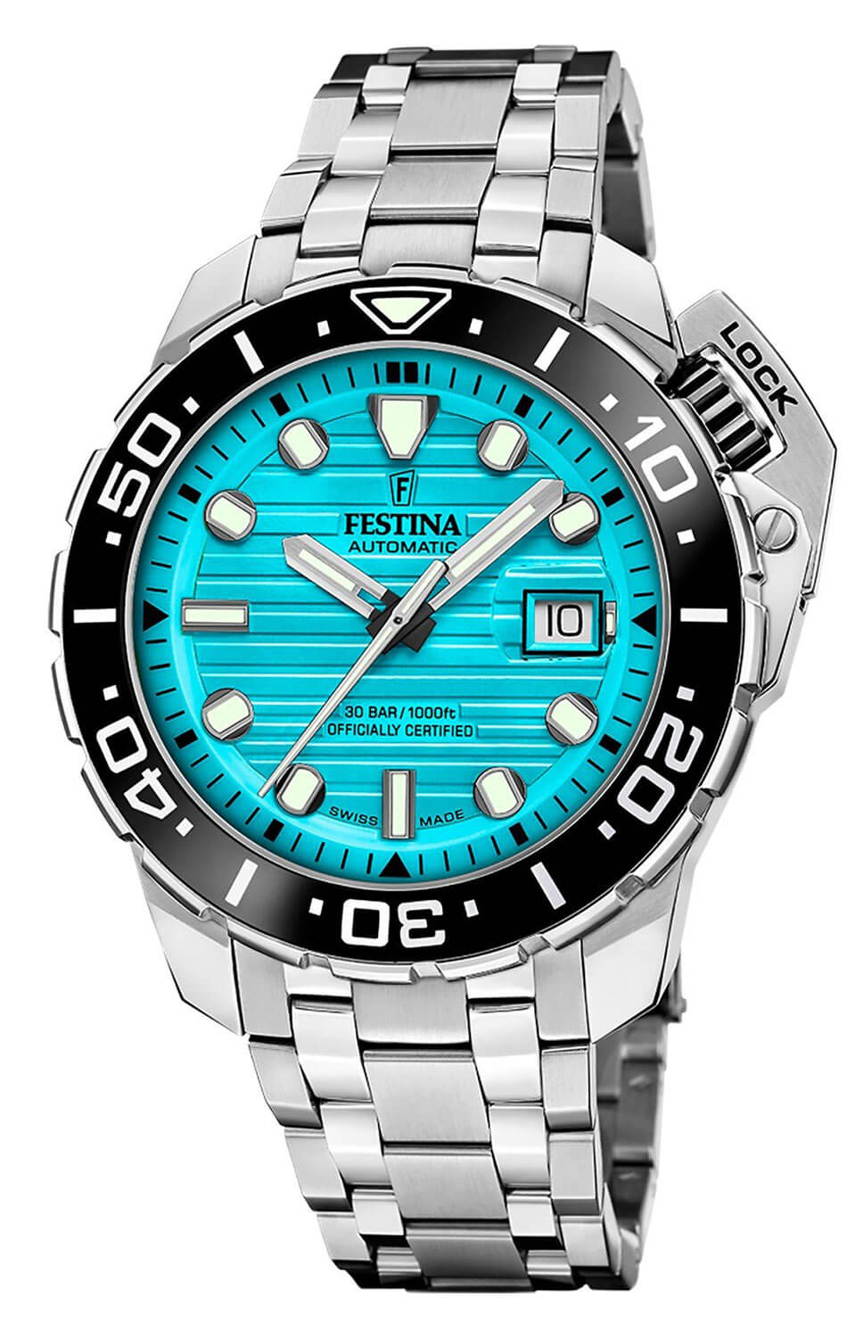 Pod odolným safírovým sklíčkem se nachází pečlivě navržený světle modrý ciferník "ice blue" ve stylu diver. Vybavený výraznými ručičkami a indexy poskytuje snadné čtení času na první pohled. Tyto prvky jsou pokryty luminiscenční vrstvou, díky níž zůstávají hodinky Festina F200435 čitelné i v naprosté tmě. Na ciferníku se nachází také datumovka, jejíž čtení usnadňuje integrovaná lupa. Srdcem tohoto modelu je švýcarský automatický mechanismus Newton Soprod, který se vyznačuje přesností potvrzenou certifikátem COSC. Tento spolehlivý mechanismus exceluje jak při extrémních ponorech, tak v každodenních situacích, a nabízí bezkonkurenční přesnost v každé situaci.