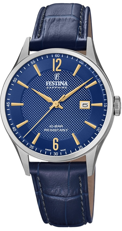 Pánské hodinky Festina Swiss Made F20007/3 jsou návratem Festiny ke kořenům, kdy měla sídlo a továrnu ve Švýcarsku. Přesun části výroby do vlasti hodinářství vyústil ve vznik plně švýcarských hodinek Festina, což potvrzuje i nápis „ SWISS MADE “ na číselníku. Klasický vzhled hodinek je odkazem na první modely značky. Elegantní pouzdro z nerezové oceli má průměr 40 mm. Vysoká třída těsnosti 10 barů umožňuje plavání. Krásný modrý ciferník s arabskými indexy je chráněn safírovým sklem odolným proti poškrábání. Uvnitř hodinek se nachází švýcarský Machineek Ronda na baterie.