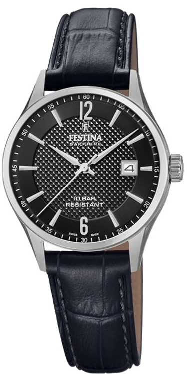 Dámské hodinky Festina Swiss Made F20009/4 jsou návratem Festiny ke kořenům, kdy měla sídlo a továrnu ve Švýcarsku. Přesun části výroby do vlasti hodinářství vyústil ve vznik plně švýcarských hodinek Festina, což potvrzuje i nápis „ SWISS MADE “ na číselníku. Klasický vzhled hodinek je odkazem na první modely značky. Elegantní pouzdro z nerezové oceli má průměr 29 mm. Vysoká třída těsnosti 10 barů umožňuje plavání. Krásný černý ciferník s arabskými indexy je chráněn safírovým sklem odolným proti poškrábání. Uvnitř hodinek se nachází švýcarský Machineek Ronda na baterie.