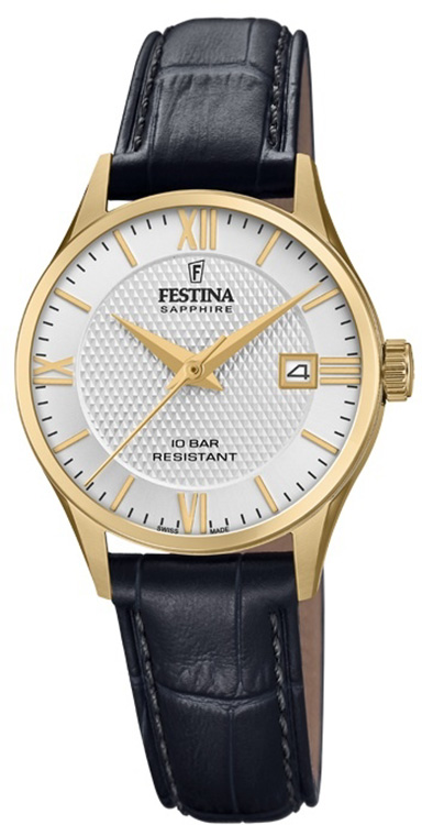 Dámské hodinky Festina Swiss Made F20011/1 jsou návratem Festiny ke kořenům, kdy měla sídlo a továrnu ve Švýcarsku. Přesun části výroby do vlasti hodinářství vyústil ve vznik plně švýcarských hodinek Festina, což potvrzuje i nápis „ SWISS MADE “ na číselníku. Klasický vzhled hodinek je odkazem na první modely značky. Elegantní nerezové pouzdro má průměr 29 mm a je pokryto žlutým zlatem. Vysoká třída těsnosti 10 barů umožňuje plavání. Krásný stříbrný ciferník s římskými číslicemi je chráněn safírovým sklem odolným proti poškrábání. Uvnitř hodinek se nachází švýcarský Machineek Ronda na baterie.