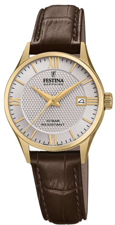 Dámské hodinky Festina Swiss Made F20011/2 jsou návratem Festiny ke kořenům, kdy měla sídlo a továrnu ve Švýcarsku. Přesun části výroby do vlasti hodinářství vyústil ve vznik plně švýcarských hodinek Festina, což potvrzuje i nápis „ SWISS MADE “ na číselníku. Klasický vzhled hodinek je odkazem na první modely značky. Elegantní nerezové pouzdro má průměr 29 mm a je pokryto žlutým zlatem. Vysoká třída těsnosti 10 barů umožňuje plavání. Krásný stříbrný ciferník s římskými číslicemi je chráněn safírovým sklem odolným proti poškrábání. Uvnitř hodinek se nachází švýcarský Machineek Ronda na baterie.