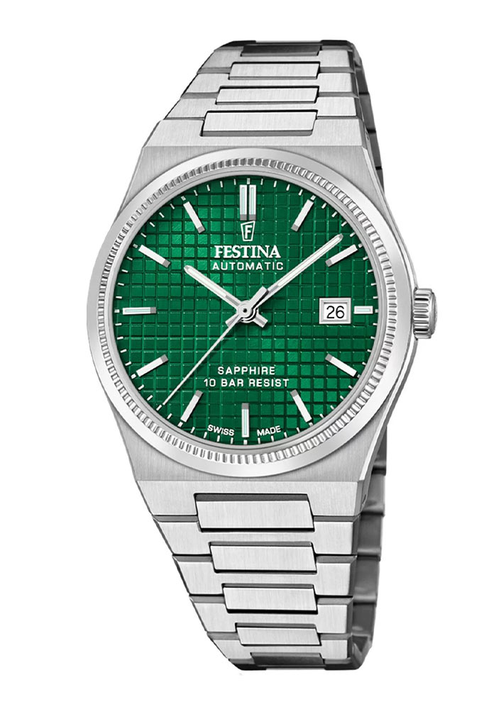 Tyto klasické pánské hodinky Festina jsou zepředu chráněny vysoce kvalitním safírovým sklem. Tvrdé sklo odolné proti poškrábání kryje zelený, minimalistický ciferník se vzorem malých čtverečků. Čas udávají stříbrné ručičky s luminiscenční hmotou, která svítí ve tmě. Ve tři hodiny je v rámečku datumovka, která ukazuje aktuální den v měsíci. Pozici 12 hodin zdobí hrdé logo značky Festina Automatic. Pod číselníkem byl instalován automatický mechanismus Saprod Newton. Výhradně švýcarský strojek byl postaven tak, aby 100% splňoval požadavky na automatický kalibr s označením Swiss Made. Tento unikátní a přesný systém zaručuje výkonovou rezervu až 44 hodin. Jejich složité uspořádání a chod lze pozorovat díky průhlednému krytu na zadní straně hodinek.