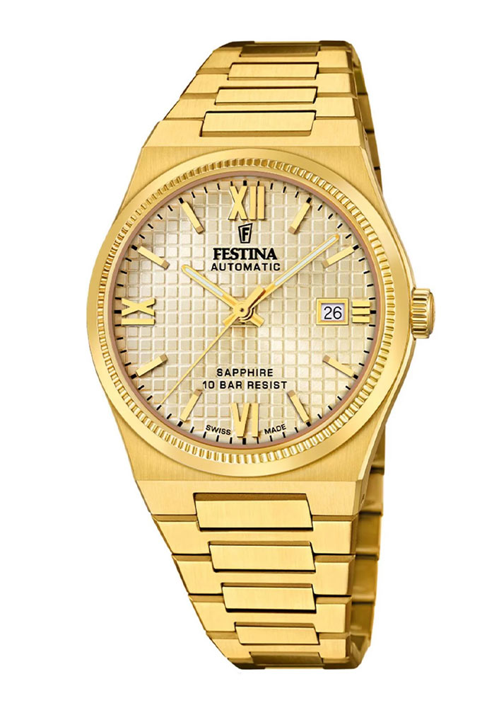 Tyto klasické pánské hodinky Festina jsou zepředu chráněny vysoce kvalitním safírovým sklem. Tvrdé a proti poškrábání odolné sklo kryje zlatý, minimalistický ciferník se vzorem malých čtverečků. Čas udávají pozlacené ručičky s luminiscenční hmotou, která svítí ve tmě. Ve tři hodiny je v rámečku datumovka, která ukazuje aktuální den v měsíci. Pozici 12 hodin zdobí hrdé logo značky Festina Automatic. Pod číselníkem byl instalován automatický mechanismus Saprod Newton. Výhradně švýcarský strojek byl postaven tak, aby 100% splňoval požadavky na automatický kalibr s označením Swiss Made. Tento unikátní a přesný systém zaručuje výkonovou rezervu až 44 hodin. Jejich složité uspořádání a chod lze pozorovat díky průhlednému krytu na zadní straně hodinek.