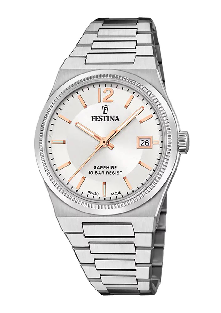 Tyto módní dámské hodinky Festina jsou zepředu chráněny tvrdým safírovým sklíčkem. Nejkvalitnější safírové okénko kryje stříbrný ciferník. Jsou na něm instalovány velké a čitelné ručičky a ocelové indexy. Speciální datum ve tři hodiny ukazuje aktuální den v měsíci. Na dvanáctém bodě je umístěno hrdé logo Festina. Pod číselníkem se nachází švýcarská mechanika Ronda, jejíž práce uspokojí každého majitele těchto hodinek Festina. Mechanismus je vyroben minimálně z 60% ve Švýcarsku, které lze nazvat hlavním městem hodinářství.