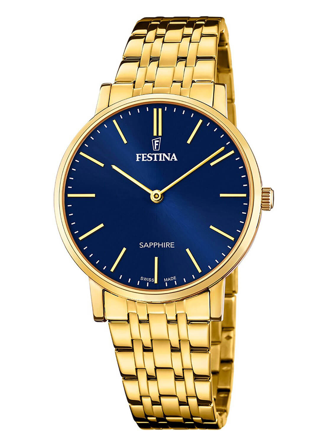Pozlacené pánské hodinky Festina Swiss Made F20046/4 jsou ideální volbou pro muže, kteří si cení elegance a funkčnosti v minimalistickém provedení. Jemný design tohoto časoměru dokonale ladí jak s formálním oblečením, tak i s každodenním stylem. Jejich univerzálnost a klasická forma činí z tohoto modelu skvělou volbu pro muže, kteří hledají nadčasový doplněk zdůrazňující jejich styl a charakter. Absence zbytečných ozdob, čistý design a přehledný ciferník dělají z těchto hodinek mimořádně atraktivní volbu pro ty, kteří upřednostňují decentní eleganci.