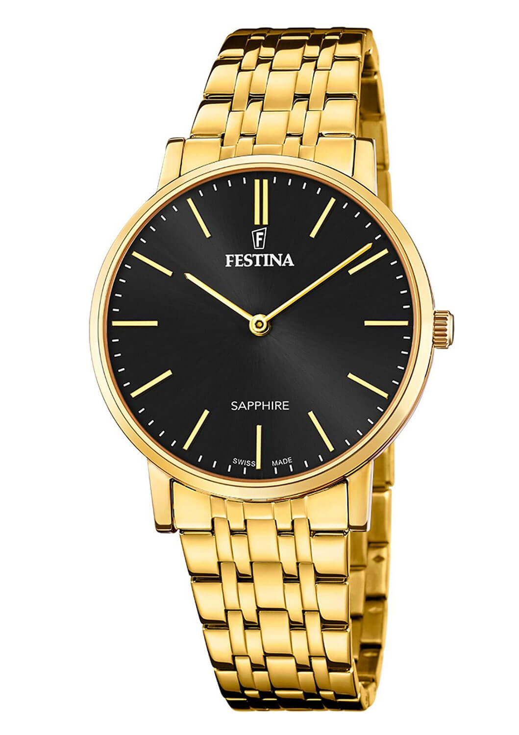 Tento model je vyroben z nejkvalitnějších materiálů, což zaručuje jeho odolnost a spolehlivost. Pouzdro o kompaktním průměru 39.30 mm je vyrobeno z ušlechtilé oceli třídy 316L se zlatou PVD vrstvou, která je známá svou odolností vůči korozi a elegantním provedením. Hodinky Festina Swiss Made jsou vybaveny safírovým sklíčkem, které se vyznačuje mimořádnou tvrdostí a odolností proti poškrábání, což zajišťuje dokonalou ochranu ciferníku po mnoho let. Celý design doplňuje pozlacený náramek s motýlkovou sponou, která nejen zvyšuje pohodlí při nošení, ale také dodává modelu sofistikovaný charakter.