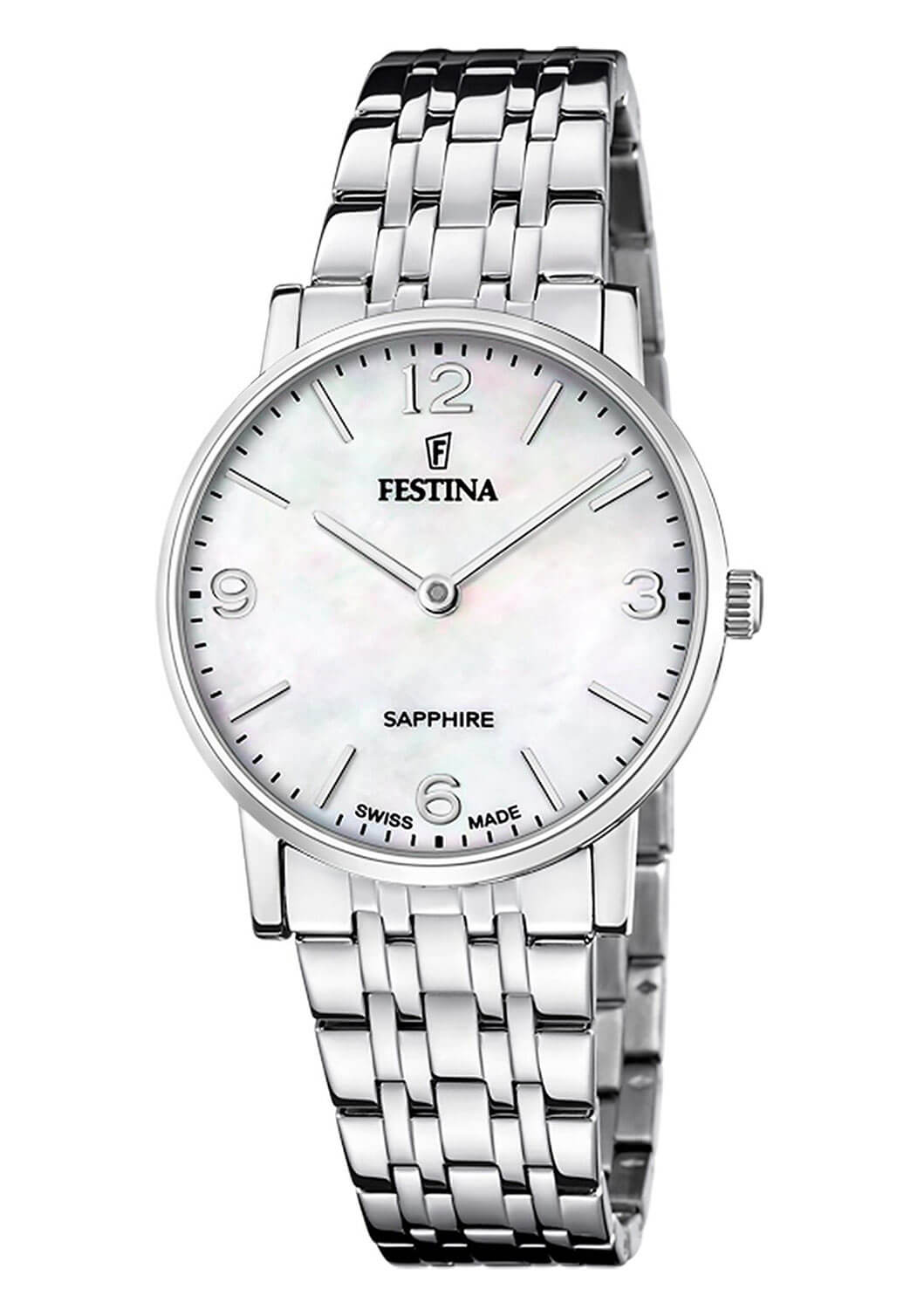 Minimalistický ciferník z krásné perleti, zdobený jemnými arabskými číslicemi a lineárními indexy, zaručuje výbornou čitelnost a skvěle doplňuje jemné ručičky. Srdcem hodinek Festina F20047-2 je švýcarský strojek Ronda, známý svou spolehlivostí a precizností, díky kterému hodinky nejen krásně vypadají, ale také po léta bezchybně fungují. Festina Swiss Made jsou více než jen hodinky – jsou symbolem třídy, dobrého vkusu a spolehlivé kvality, které podtrhnou jedinečný styl každé ženy.
