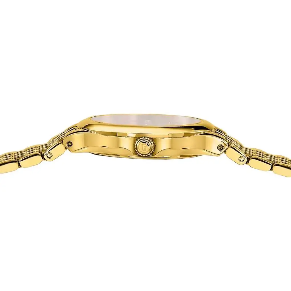 Ocelový pozlacený náramek s jemnými články plynule přechází do pouzdra a vytváří soudržnou a komfortní konstrukci, zatímco motýlková spona zajišťuje pohodlí a estetické zakončení bez viditelných prvků. Safírové sklo chrání ciferník před poškrábáním, díky čemuž si hodinky zachovávají svůj bezchybný vzhled po dlouhou dobu. Uvnitř pouzdra je instalován švýcarský mechanizmus Ronda, který zaručuje velmi přesné měření času. Jde o klasický, ženský model Swiss Made, který spojuje precizní zpracování s nadčasovým stylem a přirozenou lehkostí nošení.