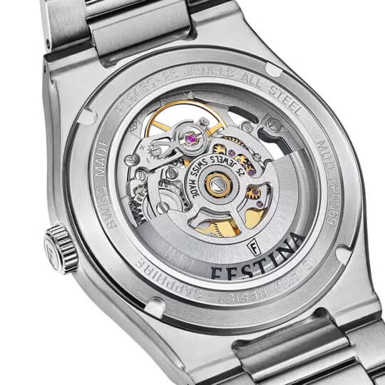 Největší ozdobou hodinek je impozantní skeletonový ciferník, který odhaluje srdce mechanismu. Tyto skeletonové hodinky Festina F20069/1 uchvátí svým prolamovaným designem – můžeme sledovat viditelný strojek v akci, což jim dodává jedinečný charakter. Designéři se postarali o každý detail, díky čemuž vznikly hodinky s odhaleným mechanismem, spojující inženýrskou přesnost s uměleckou estetikou. Uvnitř pracuje automatický strojek Soprod P024SQ, švýcarský kalibr oceňovaný pro svou přesnost a spolehlivost. Tento mechanismus vychází z osvědčených řešení (pocházejících z legendárního ETA 2824-2), díky čemuž nabízí přesné měření času a rezervu chodu přibližně 40 hodin. Důležité je, že tyto automatické hodinky Festina 20069/1 nevyžadují baterii – natahují se automaticky pohybem zápěstí, což zajišťuje pohodlí při používání a plynulý pohyb ručiček. Odhalený mechanismus není jen ukázkou technického mistrovství, ale také zdrojem fascinace pro majitele i jeho okolí.