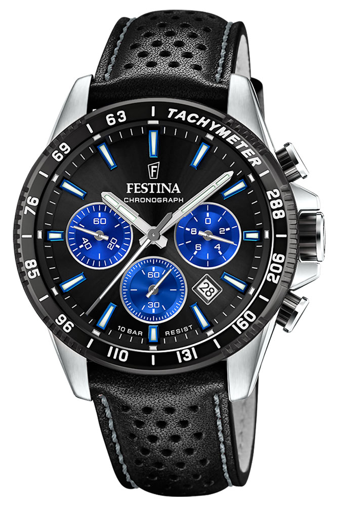 Nadčasové městské sportovní hodinky Festina F20561/6 jsou umístěny ve velkém 45mm pouzdru z nerezové oceli 316L. Jeho třída vodotěsnosti je 100 metrů (výrobek je odolný proti koupání, plavání a potápění bez potápění). Dynamický číselník s lesklými modrými totalizéry je chráněn minerálním sklem odolným proti rozbití. Pevné indexy a ručky s modrým akcentem jsou vyplněny luminiscenčním materiálem pro jasné čtení ve tmě. Velké broušené pouzdro je kombinováno s černým perforovaným koženým řemínkem v závodním stylu.