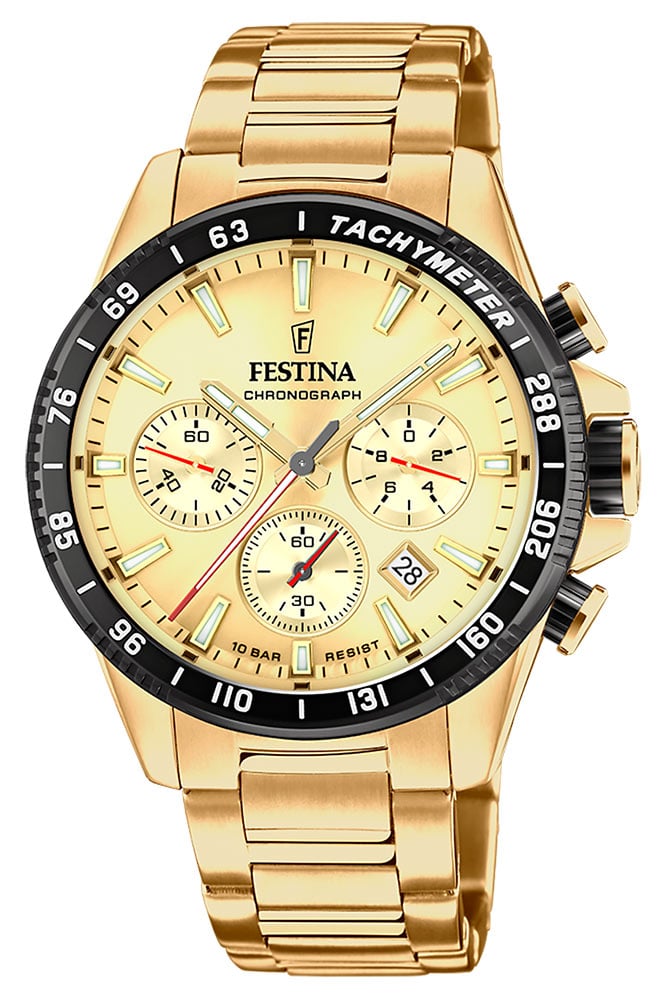 Pozlacené pánské hodinky Festina Timeless Chronograph jsou výrazným modelem stvořeným nejen pro sportovce. Pohání ho quartzový Machineek, který kromě měření hlavního času zajišťuje funkce jako: chronograf, tachymetr, datumovka.