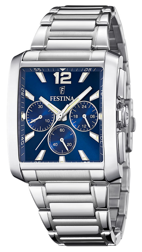 Obdélníkové pánské hodinky Festina Timeless Chronograph nabízí velmi elegantní, nevšední a funkční design za dostupnou cenu. Je výrazným doplňkem pro každodenní použití, do práce i na běžné vycházky.
