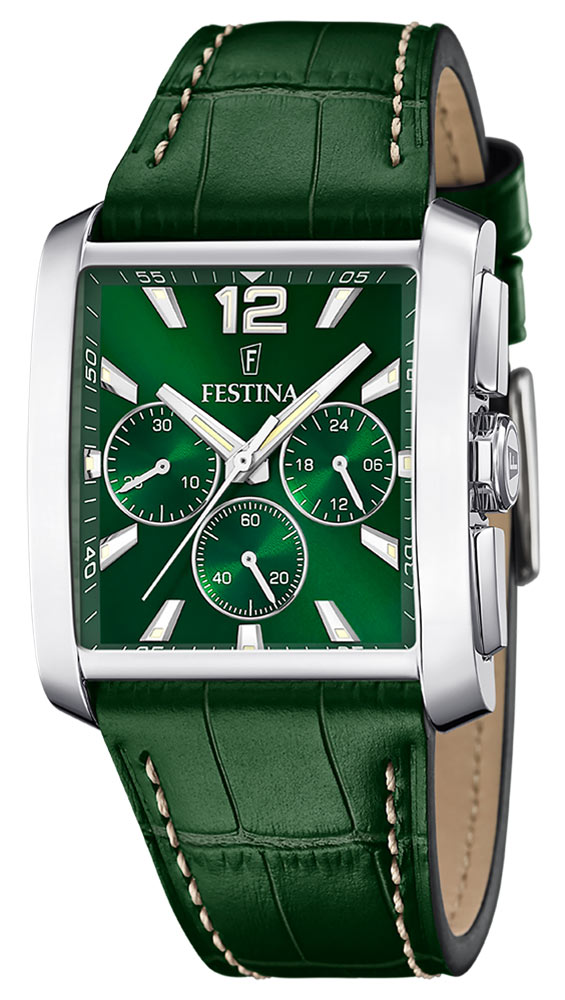 Obdélníkové pouzdro ve stylu Festina Rectangular je vyrobeno z nerezové oceli 316L - kovu ceněného pro své hypoalergenní vlastnosti a také vysokou odolnost proti korozi a mechanickému poškození. Navíc jeho elegantní vzhled může mít různé tváře v závislosti na metodě dokončení, což poskytuje fantastický vizuální efekt. Obdélníkové pánské hodinky Festina s chronografem mají 38mm pouzdro s leštěným povrchem ve vysokém lesku. Ciferník spolu s totalizéry oslňuje zelenou, zářivou září slunečního brusu. Celek se vyznačuje třídou voděodolnosti 5 ATM / 50 m .