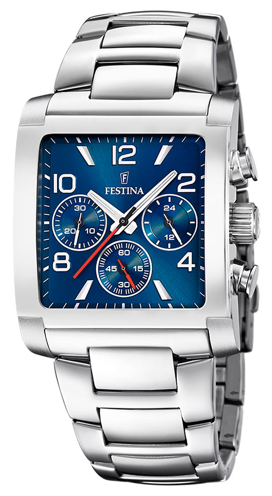 Pánské čtvercové hodinky Festina Timeless Chronograph nabízí velmi elegantní, nevšední a funkční design za dostupnou cenu. Je výrazným doplňkem pro každodenní použití, do práce i na běžné vycházky.