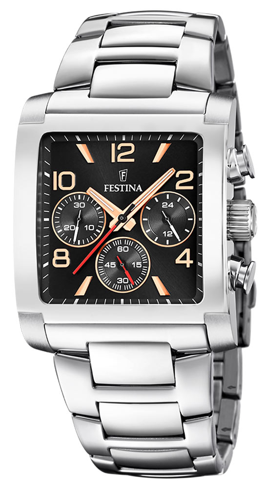 Pánské čtvercové hodinky Festina Timeless Chronograph nabízí velmi elegantní, nevšední a funkční design za dostupnou cenu. Je výrazným doplňkem pro každodenní použití, do práce i na běžné vycházky.