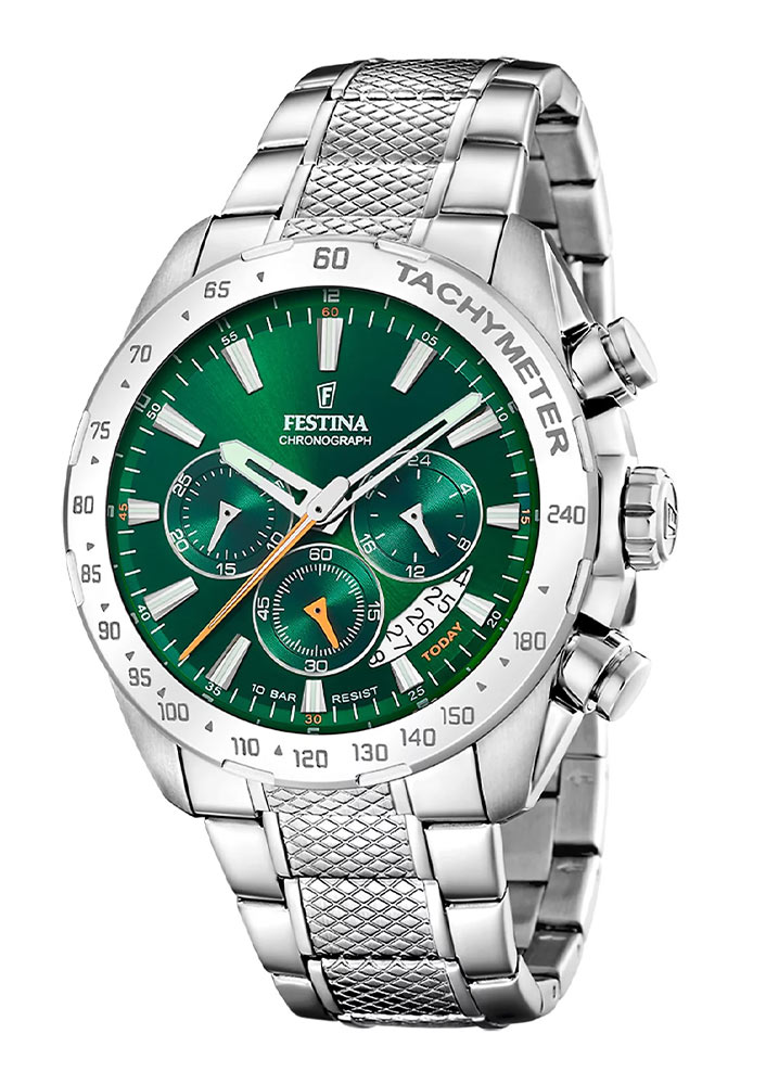 Sportovní hodinky Festina s chronografem jsou na přední straně kryté tvrdým minerálním sklem. Průhledné okénko tohoto chronografu chrání zelený číselník bohatý na užitečné funkce. Čas ukazují velké kostlivé ručičky a indexy. Je na ně umístěna speciální hmota, která ve tmě svítí a usnadňuje tak odečítání času za zhoršených světelných podmínek. Pánské hodinky Festina Chronograph jsou vybaveny rozšířeným zobrazením data, které ukazuje aktuální den v měsíci. Klasické datumovky zobrazují pouze jeden den, ale u tohoto modelu vidíte většinu ciferníku zobrazující datum. Na třetí hodině je subciferník, který ukazuje 12/24 hodinový čas, na šesté a deváté hodině jsou číselníky chronografu. Mužům, kteří jsou neustále na cestách, se bude hodit chronograf. Chronograf, obvykle nazývaný stopky, bude měřit čas přesně na sekundu.