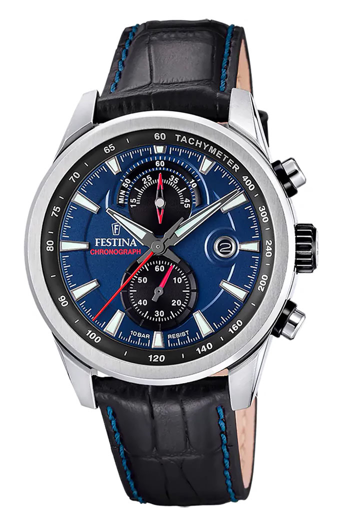 Přední stranu hodinek chrání tvrdé minerální sklíčko. Pod ním je modrý ciferník s černými počítadly, které přesně měří čas. Ručičky dýky a velké indexy jsou vyplněny luminiscencí, která umožňuje odečítat čas i ve tmě. Kontrastní červené ručky dodávají charakter celému designu číselníku. Ve tři hodiny je okénko s kulatým datem, které ukazuje aktuální den v měsíci. Pánské hodinky Festina na koženém řemínku ukazují aktuální čas s vysokou přesností, měří čas (např. při pohybových aktivitách) a informují o aktuálním dni v měsíci. Všechny funkce pohání japonský mechanismus Miyota.