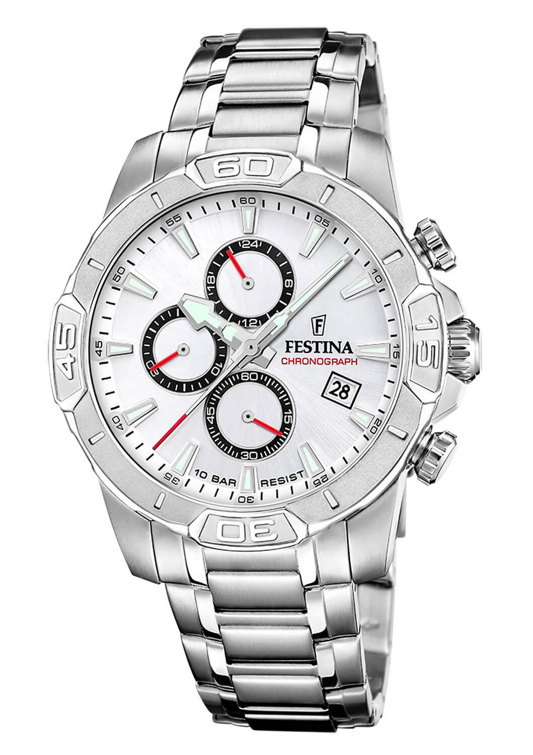 Bílý ciferník hodinek Festina Timeless Chronograph přitahuje pozornost svou přehledností a funkčností. Nacházejí se na něm subciferníky, které umožňují využití pokročilých funkcí chronografu, jako je měření času s přesností na sekundy. Hodinky také nabízejí funkci ukazatele data s aktuálním dnem v měsíci a ciferník pro zobrazení denní doby ve formátu 12/24 hodin, což usnadňuje orientaci v čase. Jemné detaily, jako červené akcenty na ručičkách a elegantní indexy, jim dodávají sportovní charakter, který vyniká mezi klasickými modely. Jsou ideální volbou pro muže, kteří hledají hodinky spojující estetiku s praktičností.