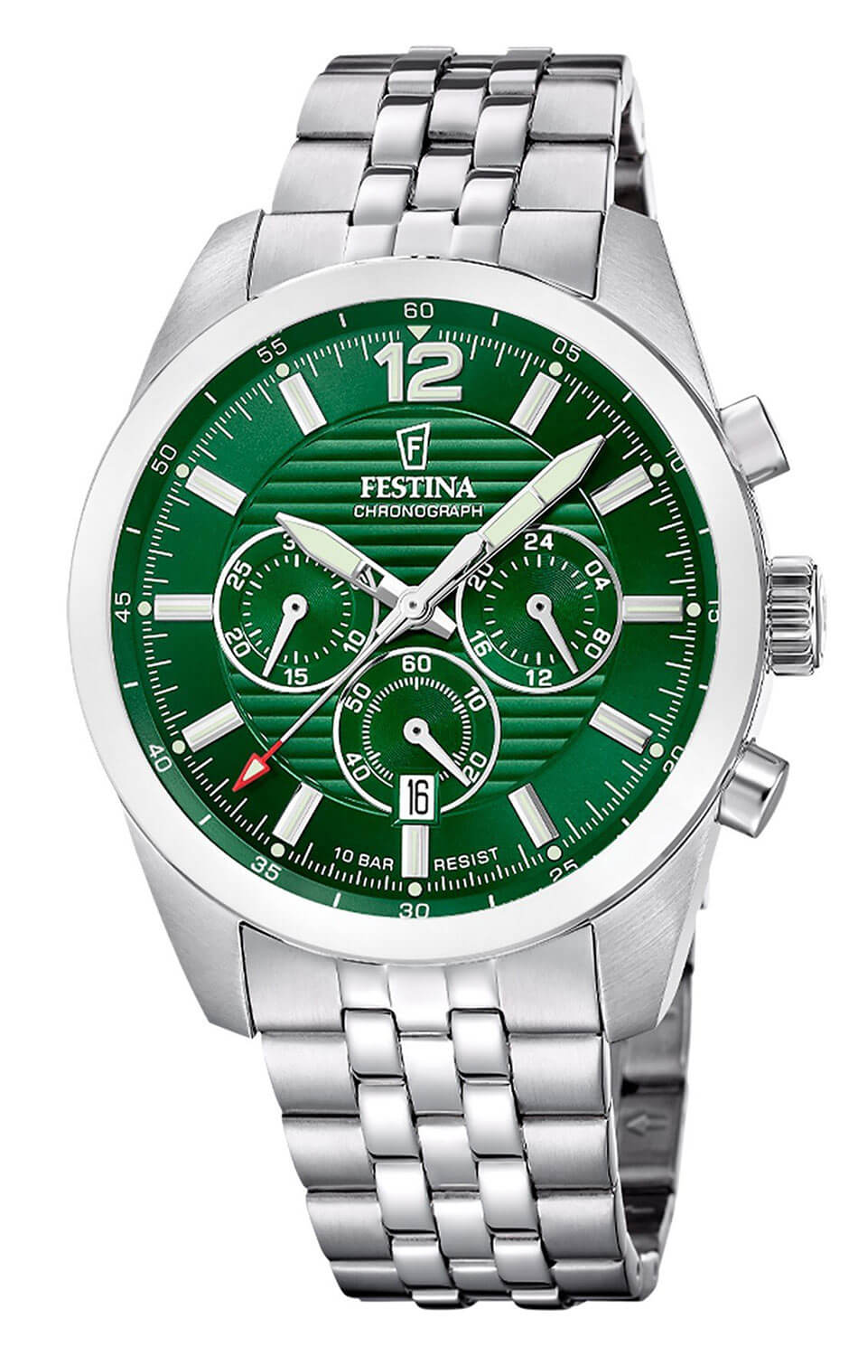 Festina Chronograph F20742-2 je vyrobena z ušlechtilé oceli, což zajišťuje odolnost a elegantní zpracování. Tmavě zelený ciferník dodává hloubku a kontrast, zatímco stříbrné indexy a ručičky potažené luminiscenční vrstvou garantují čitelnost za všech podmínek. Minerální sklíčko chrání povrch ciferníku a náramek z ušlechtilé oceli dotváří celek a podtrhuje robustní charakter hodinek. Festina Timeless je volbou pro muže, kteří chtějí mít na zápěstí sportovní, spolehlivý a funkční časoměřič.