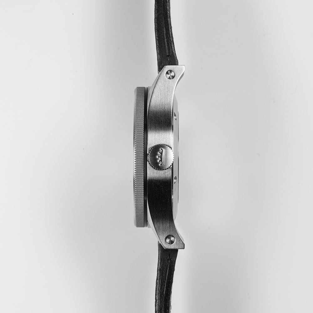 Jeho robustní a odolné pouzdro je vyrobeno ze stejně vynikající nerezové oceli, pouze v aktuální velikosti. Ciferník krytý průhledným safírovým sklíčkem s antireflexem nepoškrábajícím se opět zaujme svou velikostí. Má jasné číslice a indexy, ručičky připomínající meč, ikonickou neonově oranžovou vteřinovou ručku a trojúhelník na 12. hodině doprovázejí 2 tečky, které zlepšují čitelnost. Jedná se o hodinky pro cestovatele, které milují piloti z celého světa, profesionálové i amatéři.