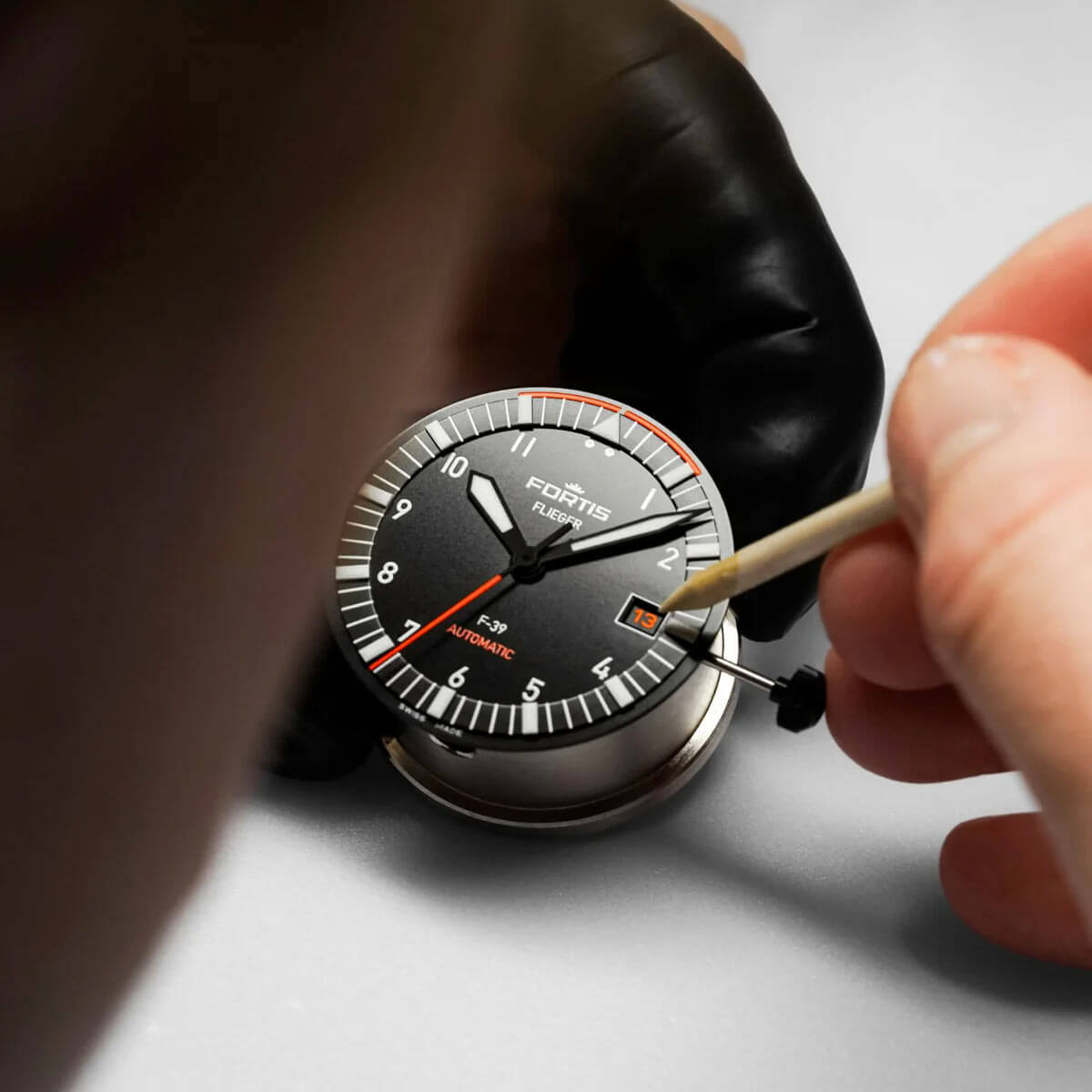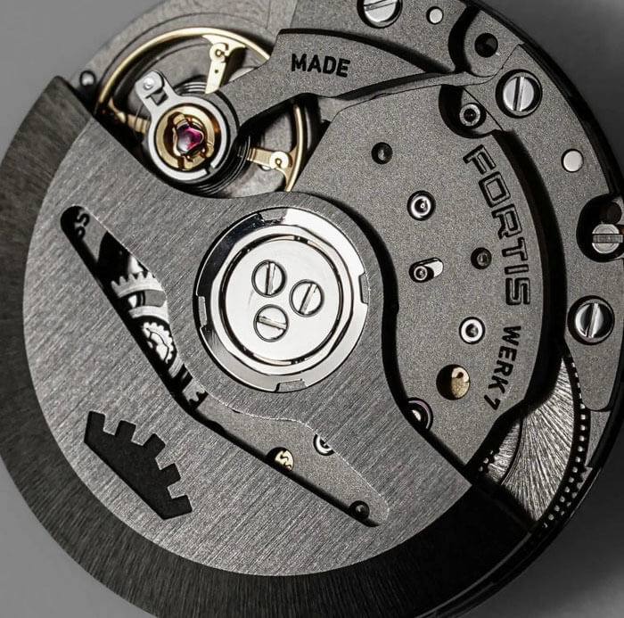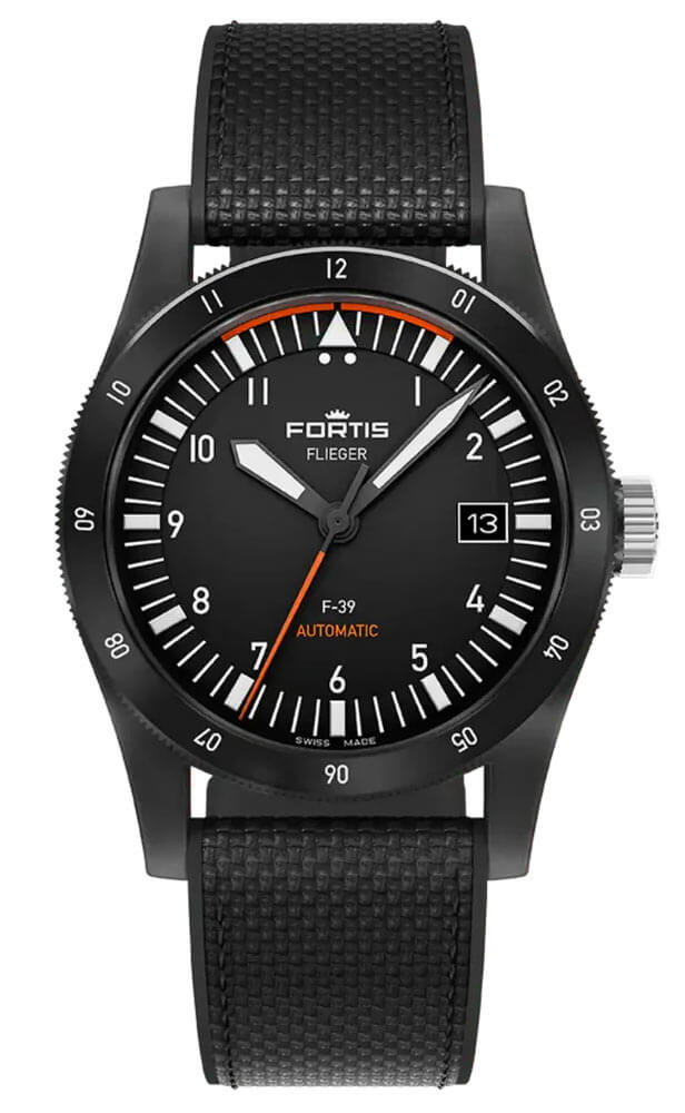 Pouzdro o průměru 39 mm je vyrobeno z pískované ušlechtilé oceli a chráněno černou DLC povrchovou úpravou s antireflexními vlastnostmi a vysokou mechanickou odolností. Hybridní řemínek z textilu a gumy FKM, šroubovací korunka se systémem těsnění a safírové sklíčko s oboustrannou antireflexní úpravou – to vše tvoří pevný celek připravený odolat vodě, prachu, náhlým změnám teploty i každodennímu opotřebení. Na černém ciferníku se nacházejí indexy potažené vrstvou Brixtrack® a oranžová vteřinová ručka – vždy dobře viditelná, i při nulové viditelnosti. Srdcem modelu je manufakturní kalibr Fortis WERK 7, vyvinutý ve spolupráci s La Joux-Perret – s rezervou chodu až 70 hodin, vysokou stabilitou a naprostou spolehlivostí v každé ose.