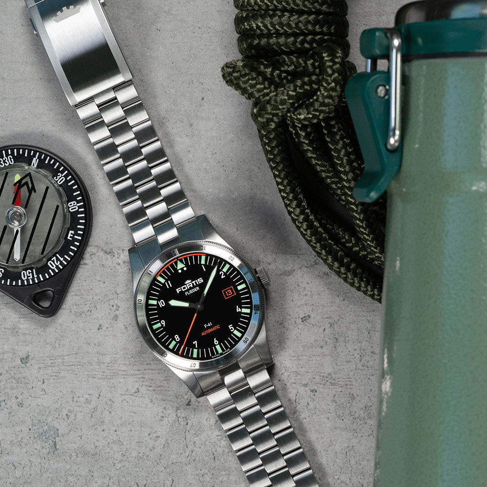 Fortis Flieger F-41 Automatic F4220008 se vyznačuje výraznými kontrasty. Je stejně tak každodenním doplňkem i náMachineovými hodinkami. Jeho barva není barva, ale funkce. Oranžová není nikdy stylová, je vždy funkční. Ocel - zelená - oranžová jsou dodnes vlastnostmi jediného, skutečného "FLIEGER" - průkopníka světové definice pilotních hodinek a dodnes je referenčním bodem pro většinu napodobitelů. Na oranžové (Berlac Fluor Orange) prvky byla použita technologie Brixtrack® zajišťující „roztíratelnost ve zlomku sekundy“ a na zelené – velmi jasný Superluminova® X1. Bez ohledu na to, kde skončíte pozdě v noci, nikdy neztratíte pojem o čase!