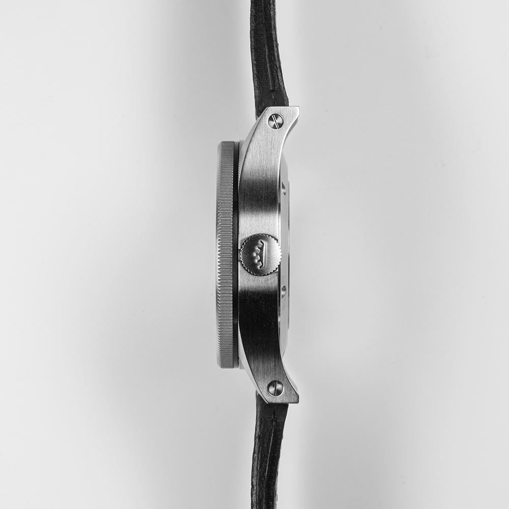 Jeho robustní a odolné pouzdro je vyrobeno ze stejně vynikající nerezové oceli, pouze v aktuální velikosti. Ciferník krytý průhledným safírovým sklíčkem s antireflexem nepoškrábajícím se opět zaujme svou velikostí. Má jasné číslice a indexy, ručičky připomínající meč, ikonickou neonově oranžovou vteřinovou ručku a trojúhelník na 12. hodině doprovázejí 2 tečky, které zlepšují čitelnost. Jedná se o hodinky pro cestovatele, které milují piloti z celého světa, profesionálové i amatéři.
