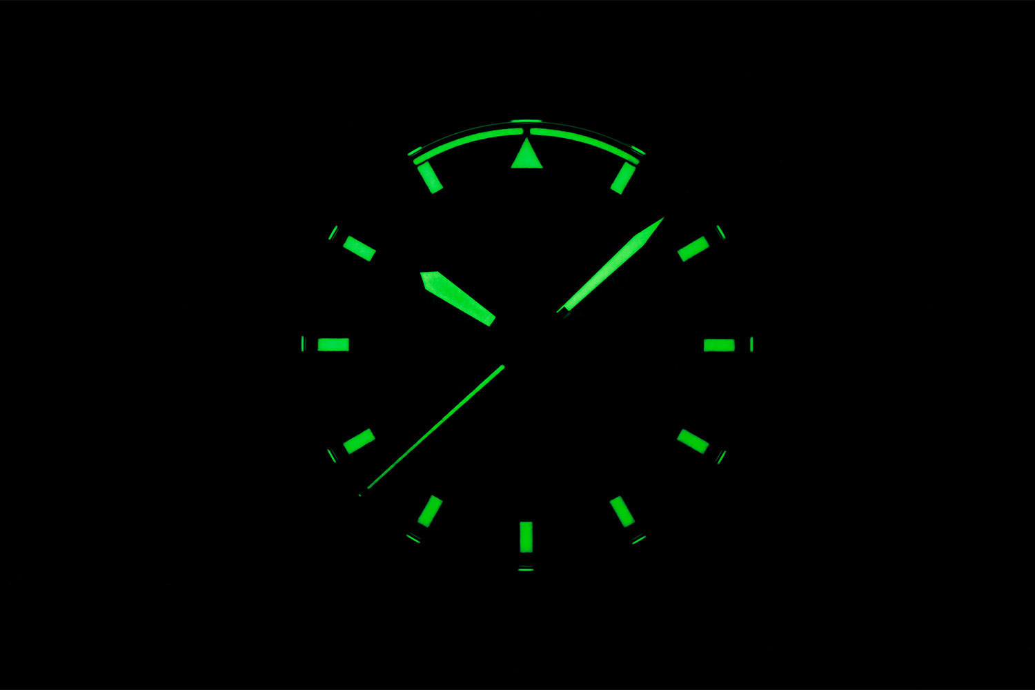 Vysoce čitelný černý ciferník chrání safírové sklíčko vysoce odolné proti poškrábání s antireflexní vrstvou na obou stranách. Aktuální čas lze odečítat díky velkým ručičkám a indexům. Výrobce vybavil časomíru funkcí sportovního chronografu - stopky se jistě budou hodit aktivním mužům. Speciální subciferníky umístěné na 3. a 9. hodině budou měřit přesný čas například při závodě. Chronograf lze ovládat pomocí tlačníků umístěných na korunce. V 6 hodin je datumové okno s aktuálním dnem v měsíci. Číselník umožňuje velmi rychle a snadno odečítat aktuální čas i v noci díky Superluminova® X1 se zeleným leskem , který se objevil na ručičkách a indexech.