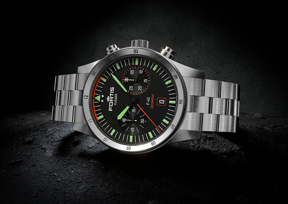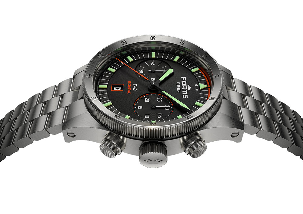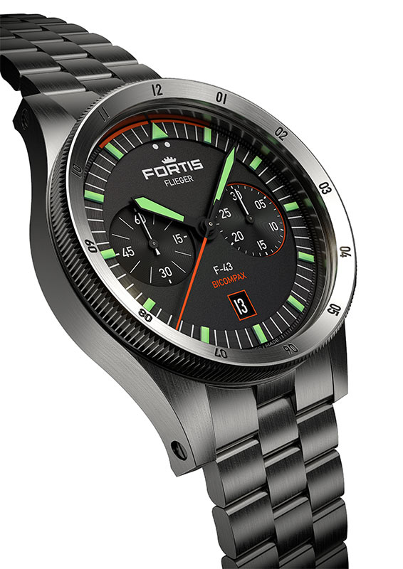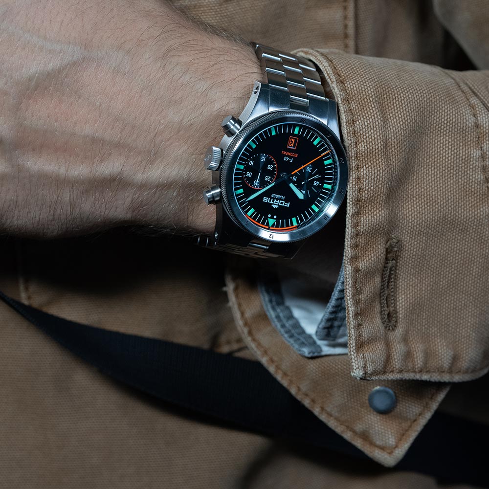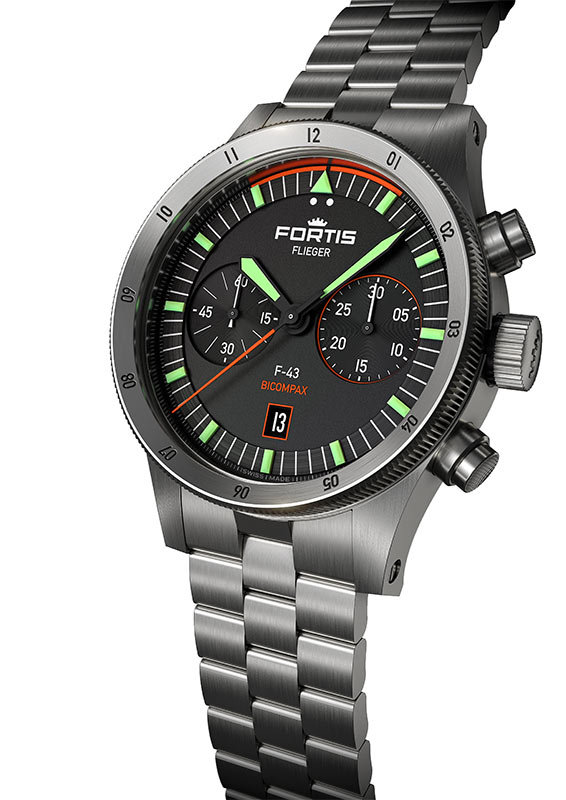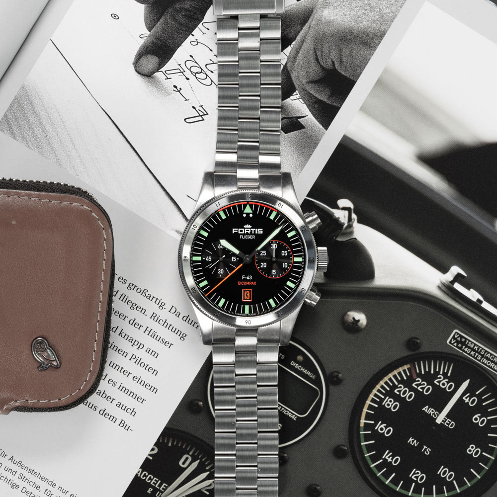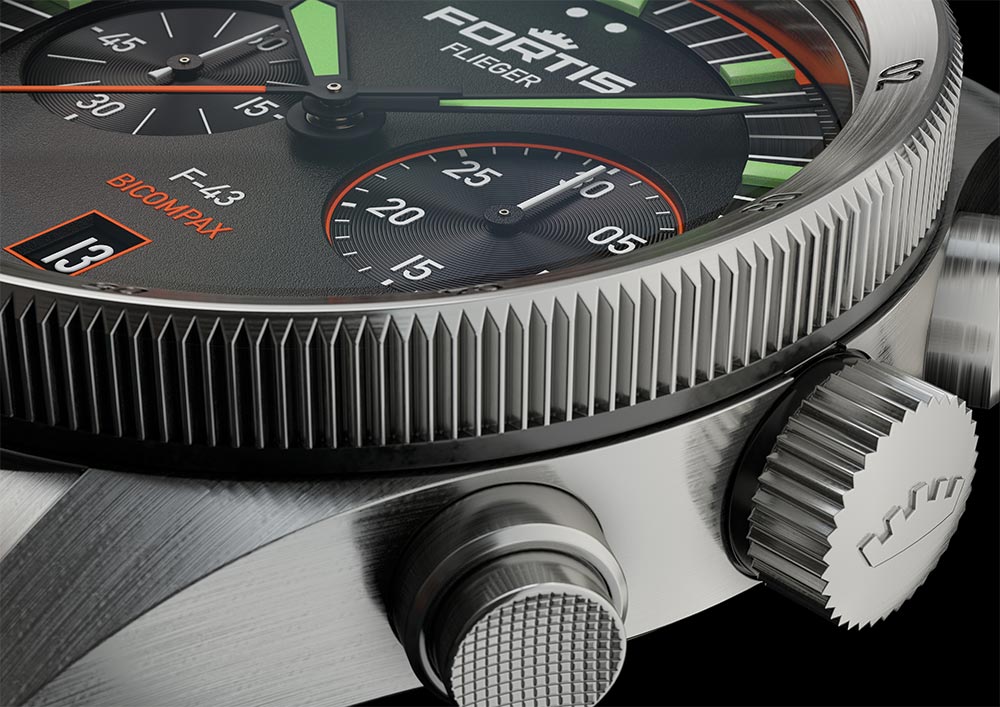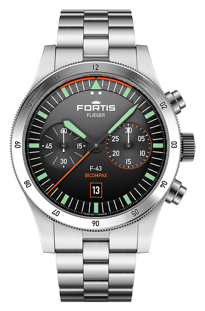 Fortis Flieger F-43 Bicompax F4240004 se vyznačuje výraznými kontrasty. Je stejně tak každodenním doplňkem i náMachineovými hodinkami. Jeho barva není barva, ale funkce. Oranžová není nikdy stylová, je vždy funkční. Ocel - zelená - oranžová jsou dodnes vlastnostmi jediného, skutečného "FLIEGER" - průkopníka světové definice pilotních hodinek a dodnes je referenčním bodem pro většinu napodobitelů. Na oranžové (Berlac Fluor Orange) prvky byla použita technologie Brixtrack® zajišťující „roztíratelnost ve zlomku sekundy“ a na zelené – velmi jasný Superluminova® X1. Bez ohledu na to, kde skončíte pozdě v noci, nikdy neztratíte pojem o čase!