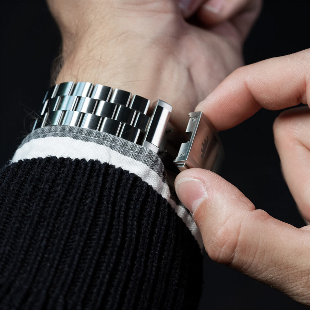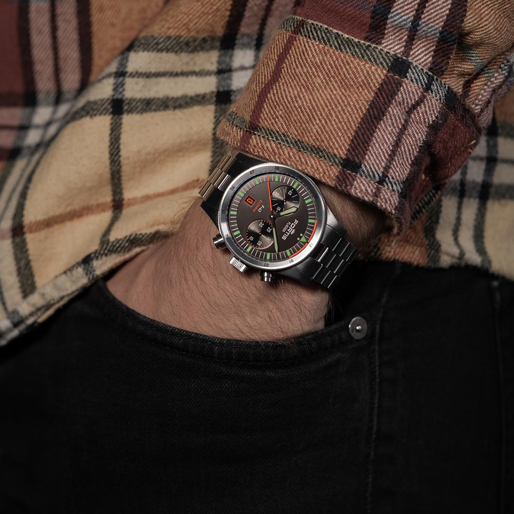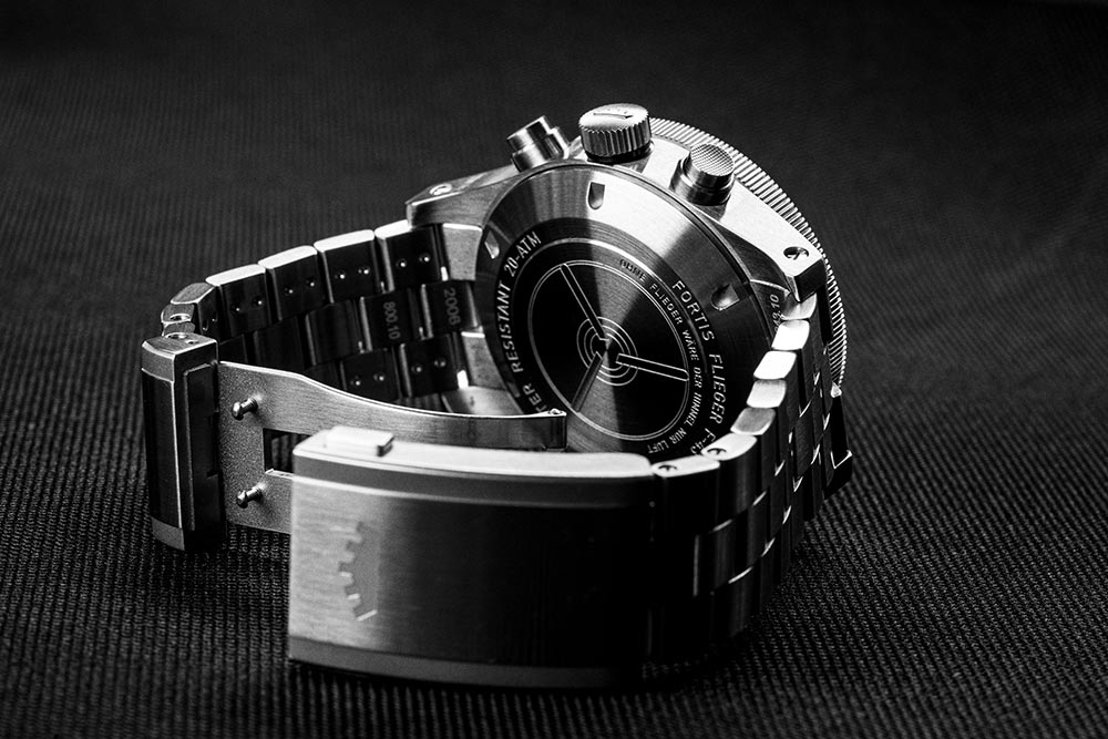 Robustní a odolné pouzdro je vyrobeno ze stejně vynikající nerezové oceli, pouze v aktuální velikosti a zavěšeno na náramku se zámkem se speciální posuvnou sponou. Tato spona má přesný posuvný systém, který vám umožní získat personalizovanou polohu náramku. Ciferník krytý průhledným safírovým sklíčkem odolným proti poškrábání s antireflexní vrstvou na obou stranách opět zaujme svou velikostí. Má jasné číslice a indexy, ručičky připomínající meč, ikonickou neonově oranžovou vteřinovku a trojúhelník na 12. hodině doprovázejí 2 tečky, zvyšující čitelnost. Jedná se o hodinky pro cestovatele, které milují piloti z celého světa, profesionálové i amatéři.