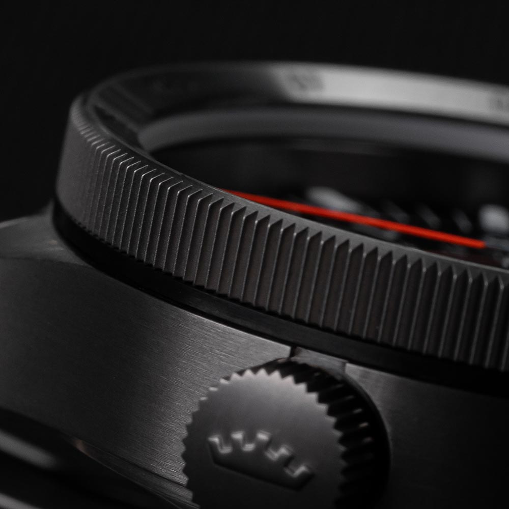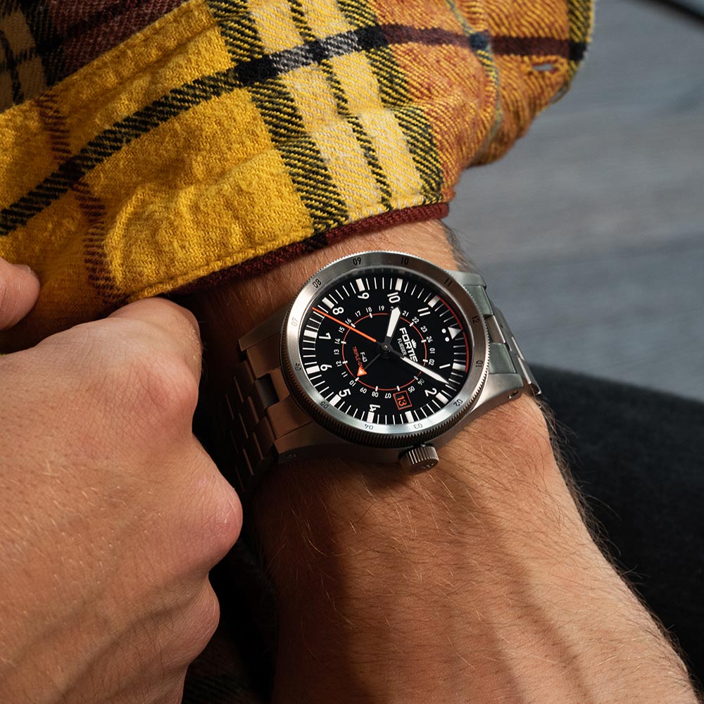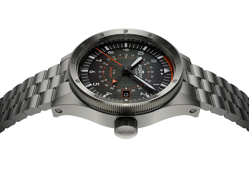 Pouzdro o průměru 43 mm je vyrobeno z odolného a lehkého titanu. Ciferník krytý průhledným safírovým sklíčkem s antireflexem nepoškrábajícím se opět zaujme svou velikostí. Má jasné číslice a indexy, ručičky připomínající meč, ikonickou neonově oranžovou vteřinovou ručku a trojúhelník na 12. hodině doprovázejí 2 tečky, které zlepšují čitelnost. Jedná se o hodinky pro cestovatele, které milují piloti z celého světa, profesionálové i amatéři.