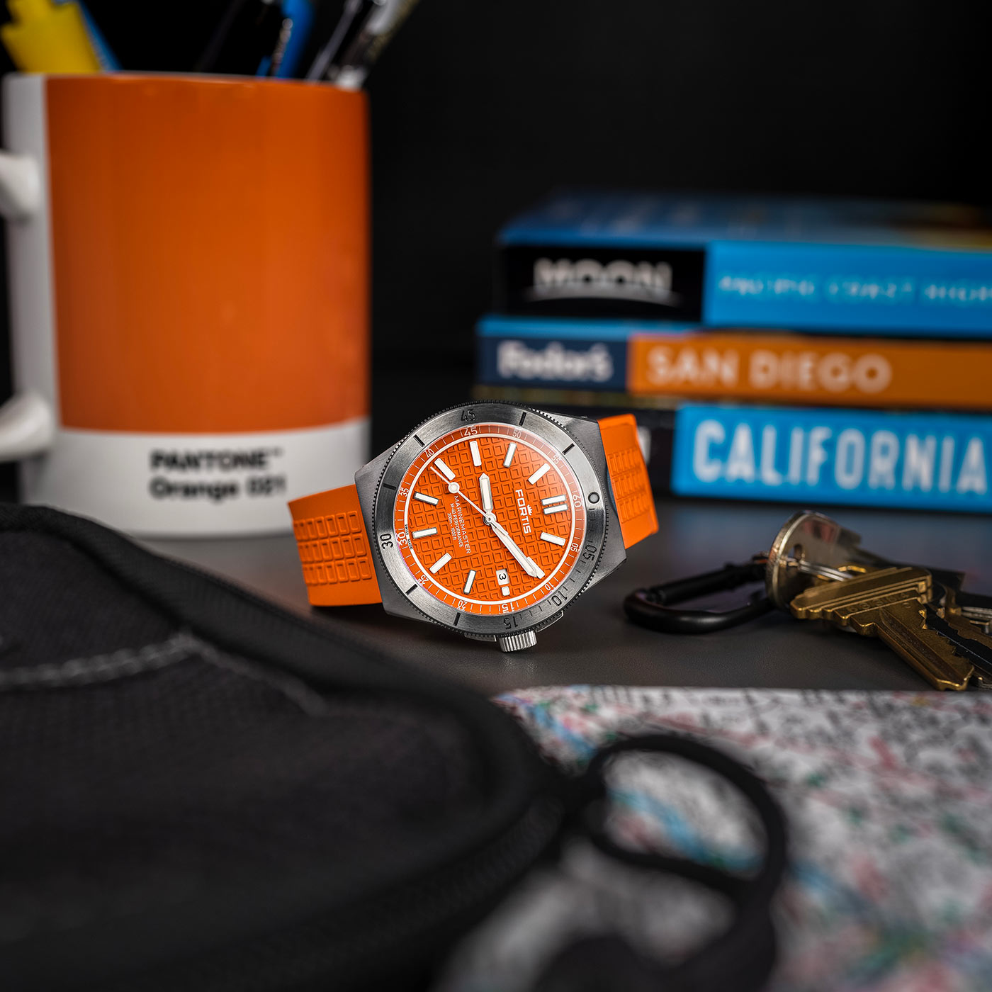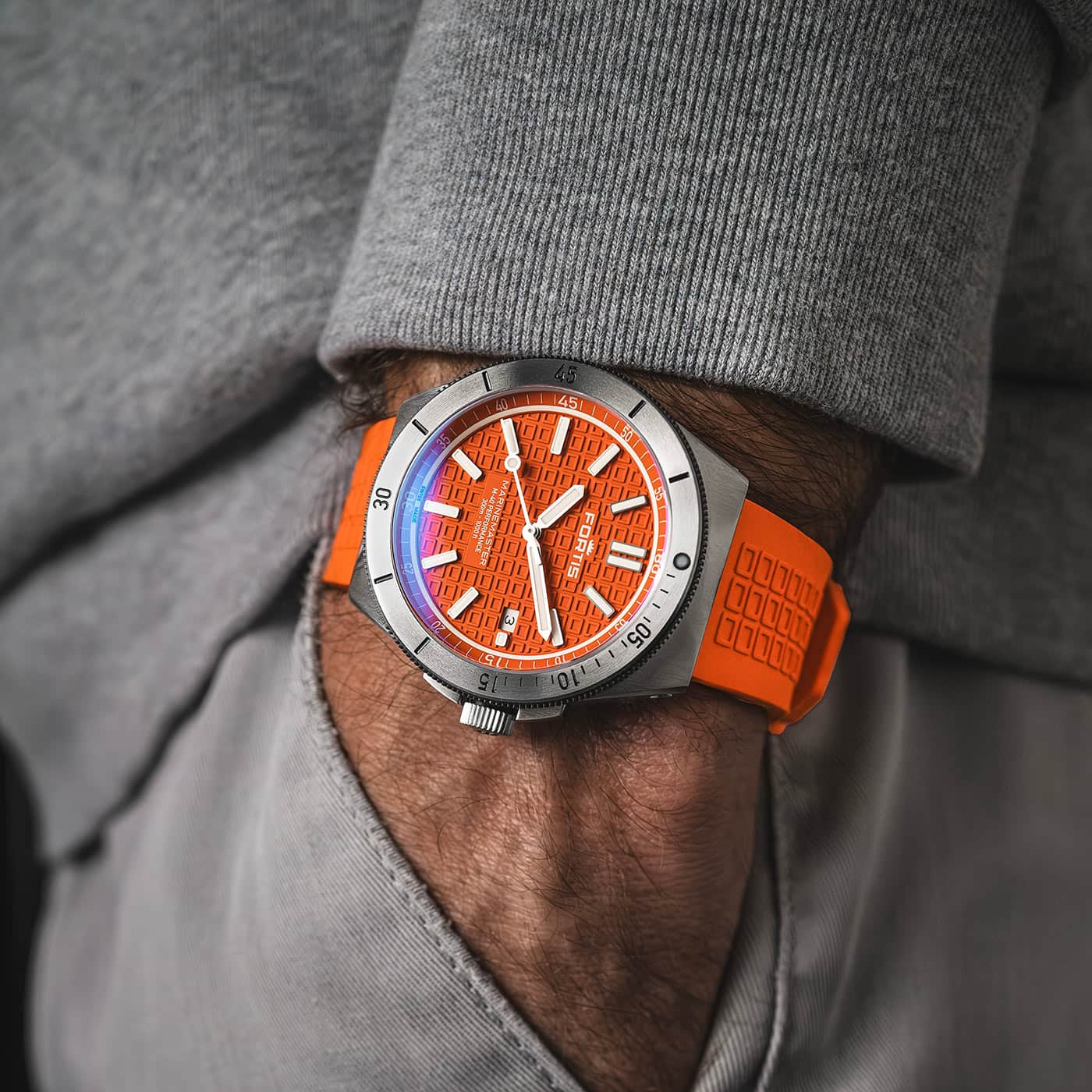 K příležitosti 70. výročí vzniku linie Marinemaster Fortis rozšířil varianty v 40mm pouzdru z recyklované nerezové oceli o nové modely obohacené o Gear Bezel™ – nejpohodlnější a nejfunkčnější jednosměrnou rotační lunetu nástrojových hodinek, jaká kdy byla navržena. K ekologickému pouzdru je připevněn originální gumový řemínek Horizon v živém jantarově-oranžovém odstínu, který uchvacuje ducha průzkumu a radost z objevování. Řádně implementovaný systém Fortis Lock System® poskytuje pevnou podporu těm, kdo milují potápění. Lakovaný ciferník s motivem Fortis O a nanesenými indexy Superluminova® X1, kovové ručičky hodin, minut a sekund s Superluminova® X1, jsou prvky, které dávají těmto hodinkám jedinečný charakter a zajistí čitelnost i za slabého osvětlení.